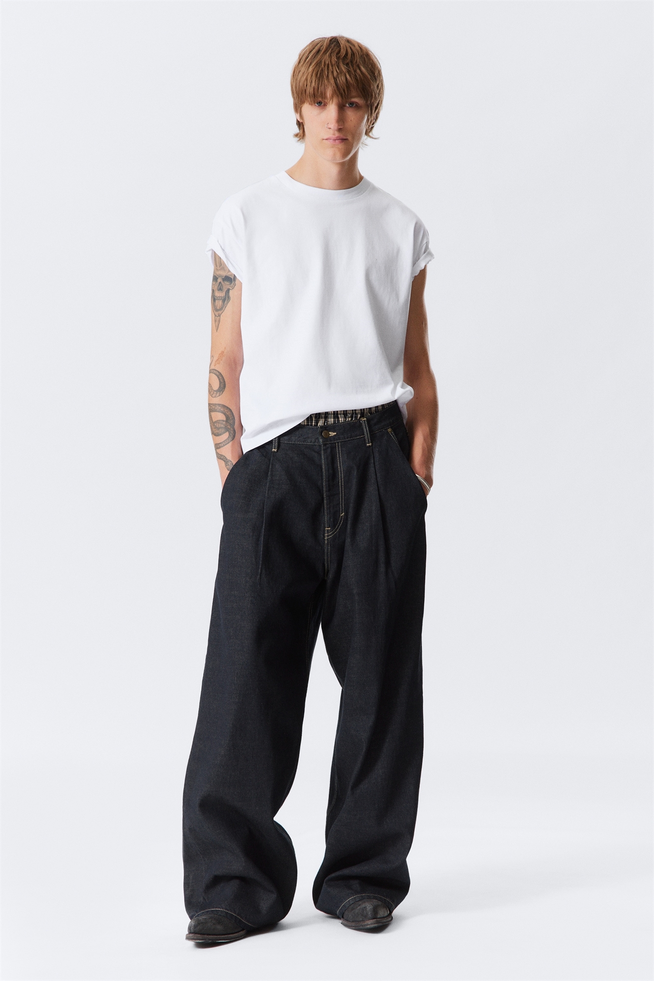 Джинсы свободного кроя с мешковатыми штанинами и плиссировкой спереди. Изготовлены из жесткого денима из органического хлопка с добавлением переработанного хлопка, имеют заутюженные складки, косые боковые карманы с заклепками и ширинку на молнии с застежкой на пуговицу.