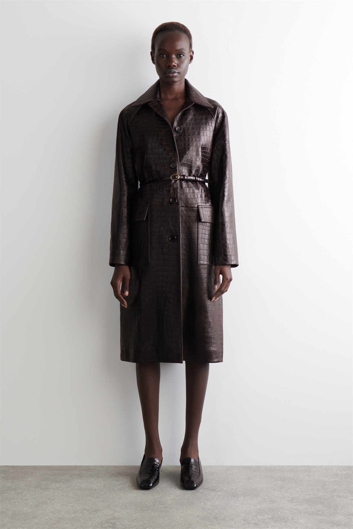 Это яркое пальто придает индивидуальность даже самым простым нарядам. Выполненное в глубоком коричневом цвете, оно изготовлено из эластичной крокодиловой кожи с тиснением и имеет угловой воротник, тональную строчку и подкладку для легкого ношения. Regular fitButton closureCOS supports responsible manufacturing through the Leather Working Group Shell: 100% Leather. Подкладка: 100% вискоза. Подкладка карманов: 100% хлопок. Без учета отделки / Чистка специалистом по коже Длина по спинке для размера EU 36 составляет 108,8 см / Модель носит размер EU 36