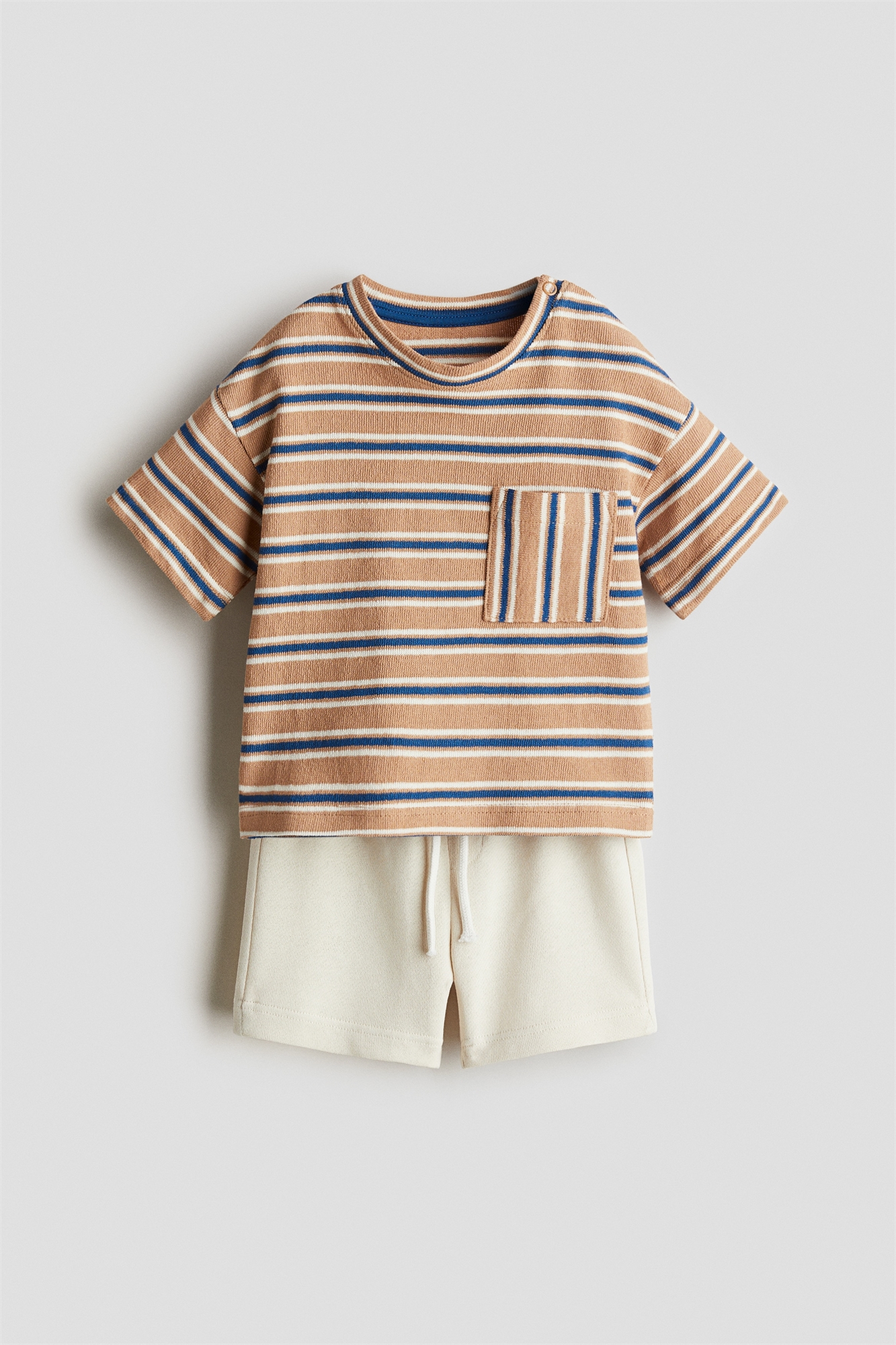 Комплект из футболки из фактурного джерси и шорт из мягкой легкой толстовки. Футболка с круглым вырезом с застежками с одной стороны (кроме размеров 2-4Y), спущенными плечами и открытым нагрудным карманом. Шорты с регулируемой утягивающей талией.