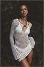 Короткое пляжное платье из трикотажа пуантелье с длинными расклешенными рукавами и вырезом-балериной с глубоким вырезом и декоративной пластиковой деталью спереди.