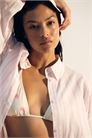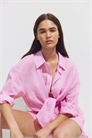 Пляжная рубашка свободного покроя из воздушного хлопкового полотна с воротником, застежкой на пуговицы спереди и коромыслом со складками сзади. Спущенные плечи и длинные рукава с манжетами на пуговицах и рукавной планкой с пуговицей. Закругленный подол.