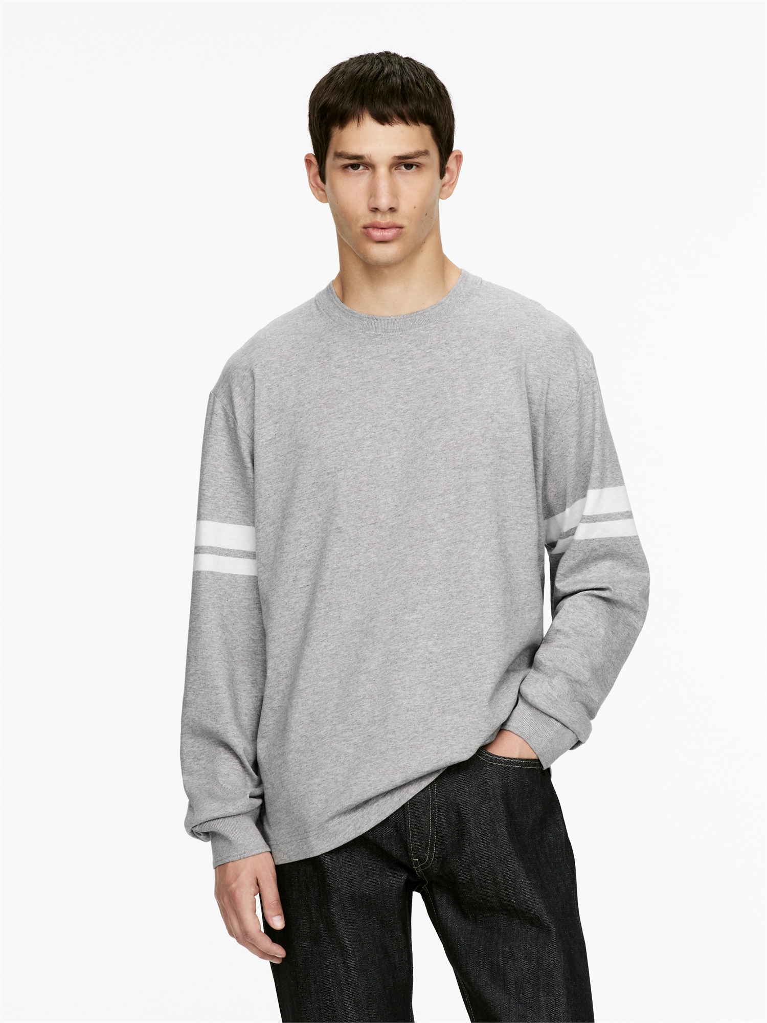 Футболка с длинными рукавами и обычным кроем. Модель с вырезом горловины и манжетами в рубчик. Разрезы в боковых швах. Окрашенные пряжей полоски на рукавах.