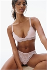 Мягкий бюстгальтер без проводов из кружева с регулируемыми бретелями и чашечками из сетки со съемными вкладышами, которые придают форму бюсту и обеспечивают хорошую поддержку. Застежка на крючки и глазки сзади.