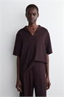Эта шоколадно-коричневая футболка предлагает современный взгляд на силуэты 60-х годов. Созданная из легкого модального трикотажа, она имеет матросский воротник, который расходится по плечам, и легко драпируется. Regular fit Материал: 83% модал, 9% эластан, 8% переработанный полиэстер. Подкладка: 100% хлопок. Без учета отделки / Машинная стирка Длина по спинке для размера S составляет 57,9 см / Модель носит размер S