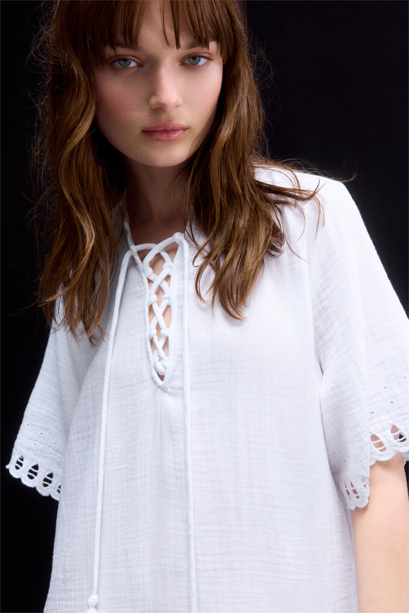 Короткое платье свободного покроя из мягкого хлопкового муслина с декоративной отделкой бродери-англиз на манжетах и подоле. Воротник-бант и V-образная пройма спереди со шнурком с кисточками. Короткие рукава и сборка по подолу для придания объема. Без подкладки.
