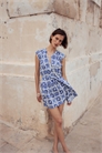 Короткое платье без рукавов из хрустящего хлопкового поплина с глубоким V-образным вырезом и двумя рядами узких завязок, завязывающихся спереди. Узкая резинка на талии и расклешенная юбка со сборками для придания объема. Без подкладки.