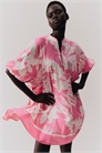 Короткое платье из тканого материала, изготовленного из смеси хлопка и вискозы. Воротник-бант, пуговицы в верхней части и узкий съемный пояс на талии. Рукава-баллон длиной до локтя покроя реглан с эластичными манжетами. Без подкладки.
