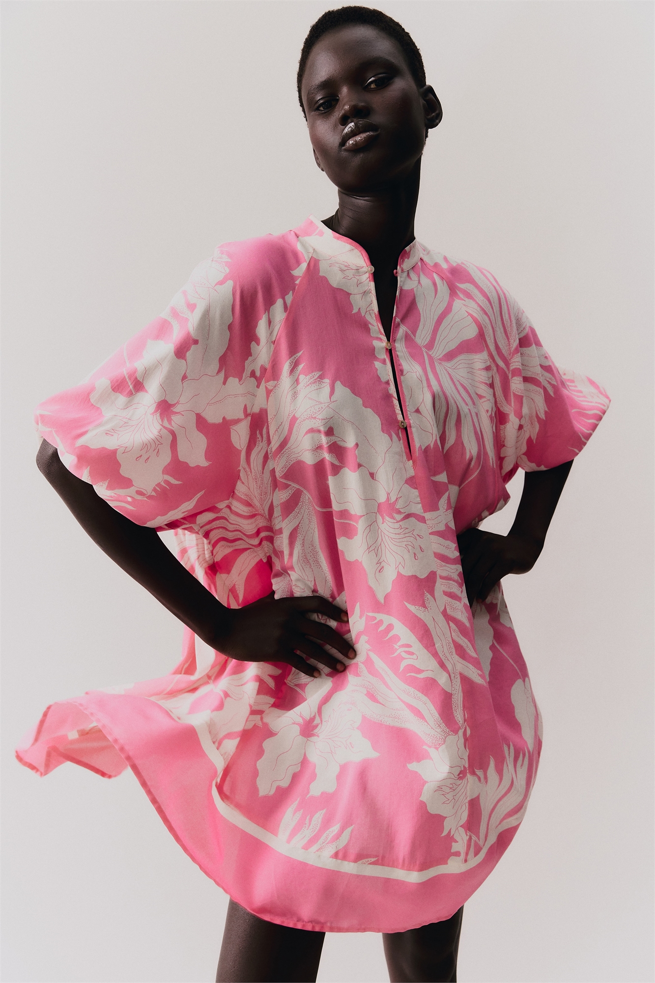 Короткое платье из тканого материала, изготовленного из смеси хлопка и вискозы. Воротник-бант, пуговицы в верхней части и узкий съемный пояс на талии. Рукава-баллон длиной до локтя покроя реглан с эластичными манжетами. Без подкладки.