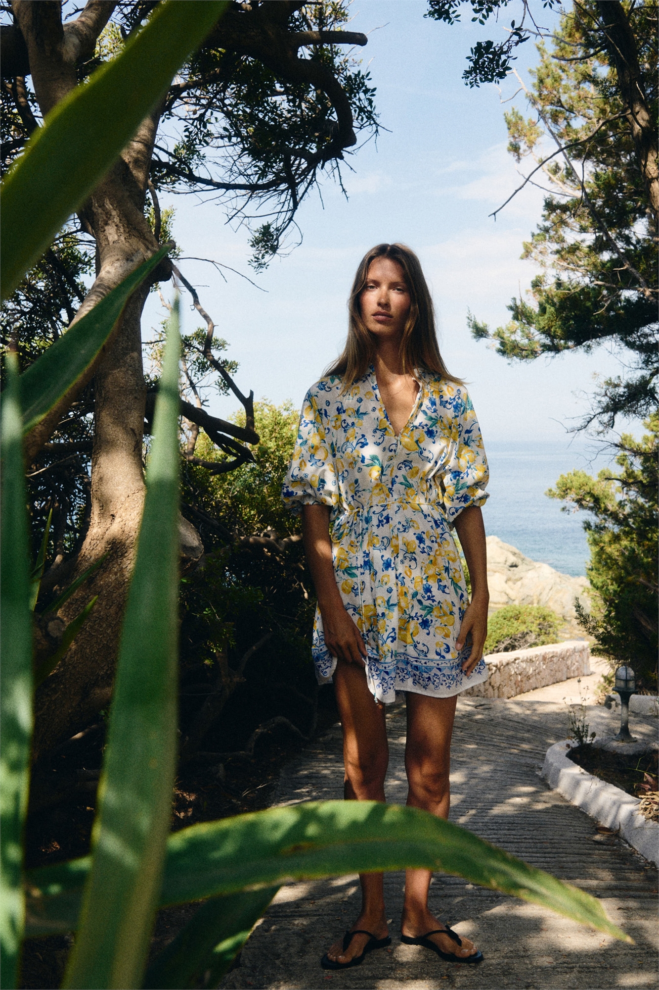 Короткое платье из тканого материала, изготовленного из смеси хлопка и вискозы. Воротник-бант, пуговицы в верхней части и узкий съемный пояс на талии. Рукава-баллон длиной до локтя покроя реглан с эластичными манжетами. Без подкладки.
