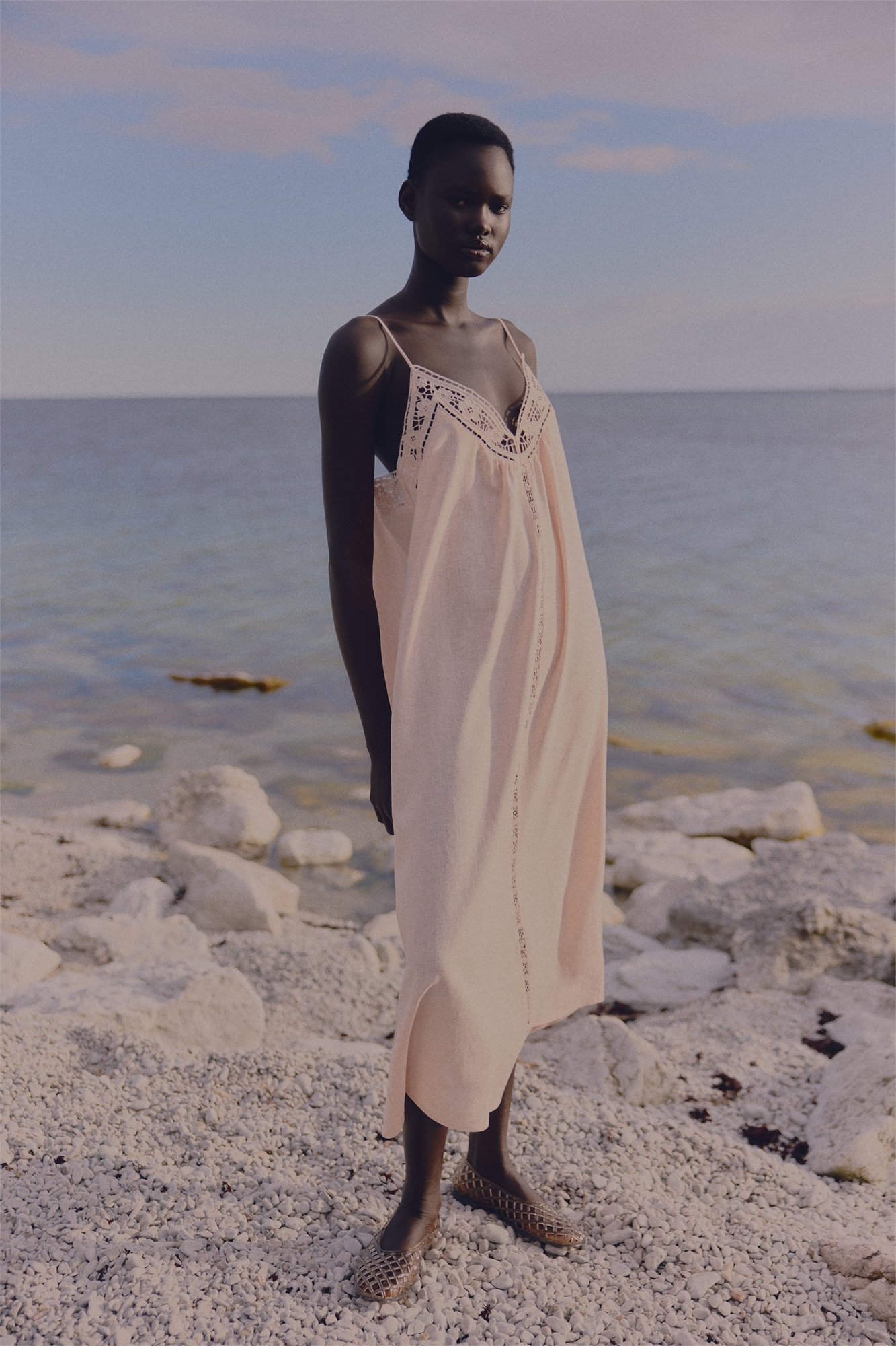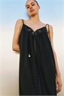 Платье А-линии длиной до колен из воздушного льна и вискозы с завязывающимися бретелями-спагетти. Верхняя часть с V-образным вырезом спереди и сборками спереди и сзади. Узкая кружевная вставка спереди. Без подкладки.