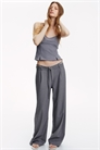 Приталенные брюки из тканого материала с заниженной талией, ширинкой на молнии, скрытой застежкой-крючком и съемным двойным поясом с металлическими D-кольцами. Потайные карманы в боковых швах и фальшивые накладные карманы сзади. Широкие ноги со складками под поясом на передней стороне, которые создают мягкую драпировку ткани.