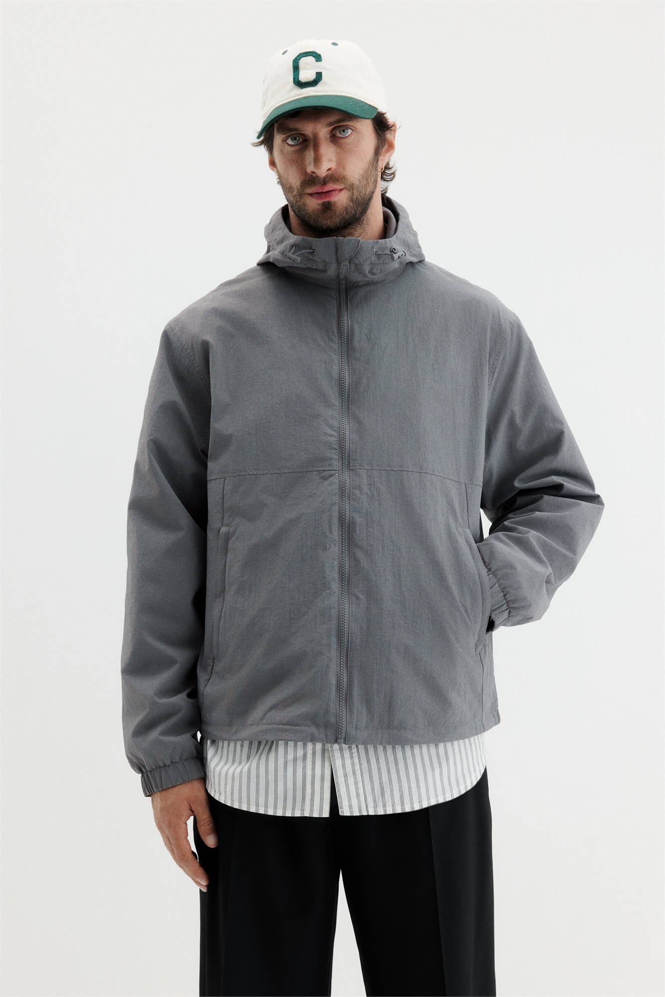 Ветровка из ветрозащитного и водоотталкивающего нейлона с капюшоном с эластичным шнурком, застежкой-молнией спереди, защитой подбородка от натирания и длинными рукавами с манжетами на резинке. Боковые карманы на молнии и внутренний карман на молнии. Скрытый эластичный шнурок на подоле. Регулярный крой для комфортной носки и классического силуэта. Сетчатая подкладка.