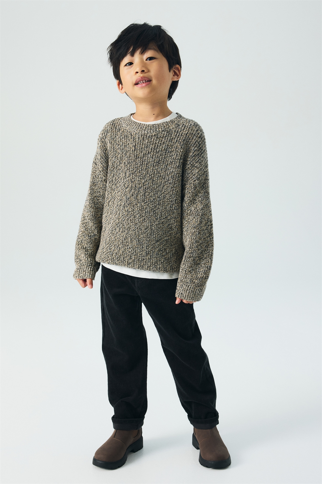 Брюки из хлопкового вельвета с непринужденной посадкой по бедрам, ляжкам и штанинам. Регулируемый эластичный пояс, ширинка на молнии с пуговицей, передние и задние карманы.