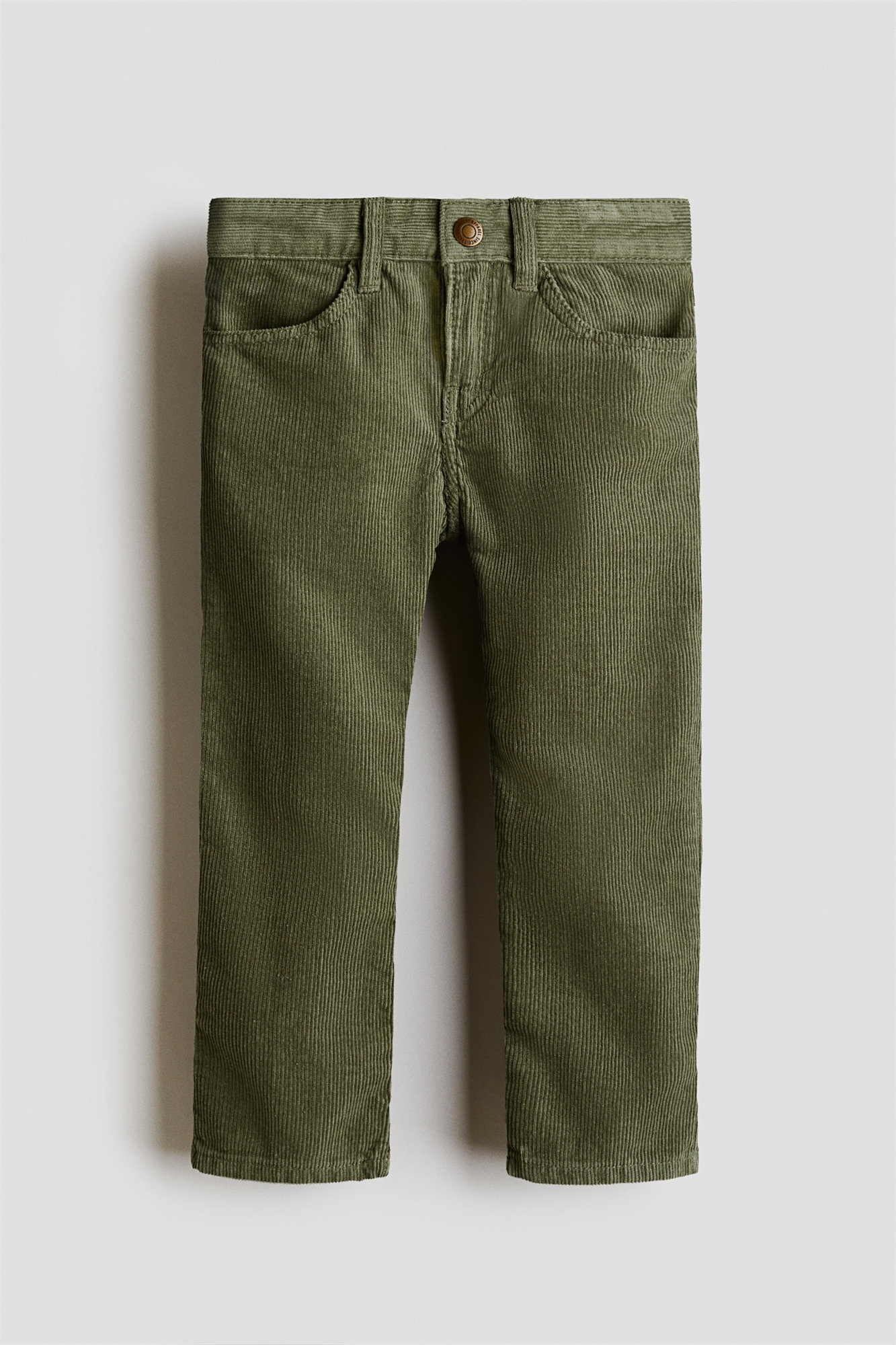 Брюки из хлопкового вельвета с непринужденной посадкой по бедрам, ляжкам и штанинам. Регулируемый эластичный пояс, ширинка на молнии с пуговицей, передние и задние карманы.