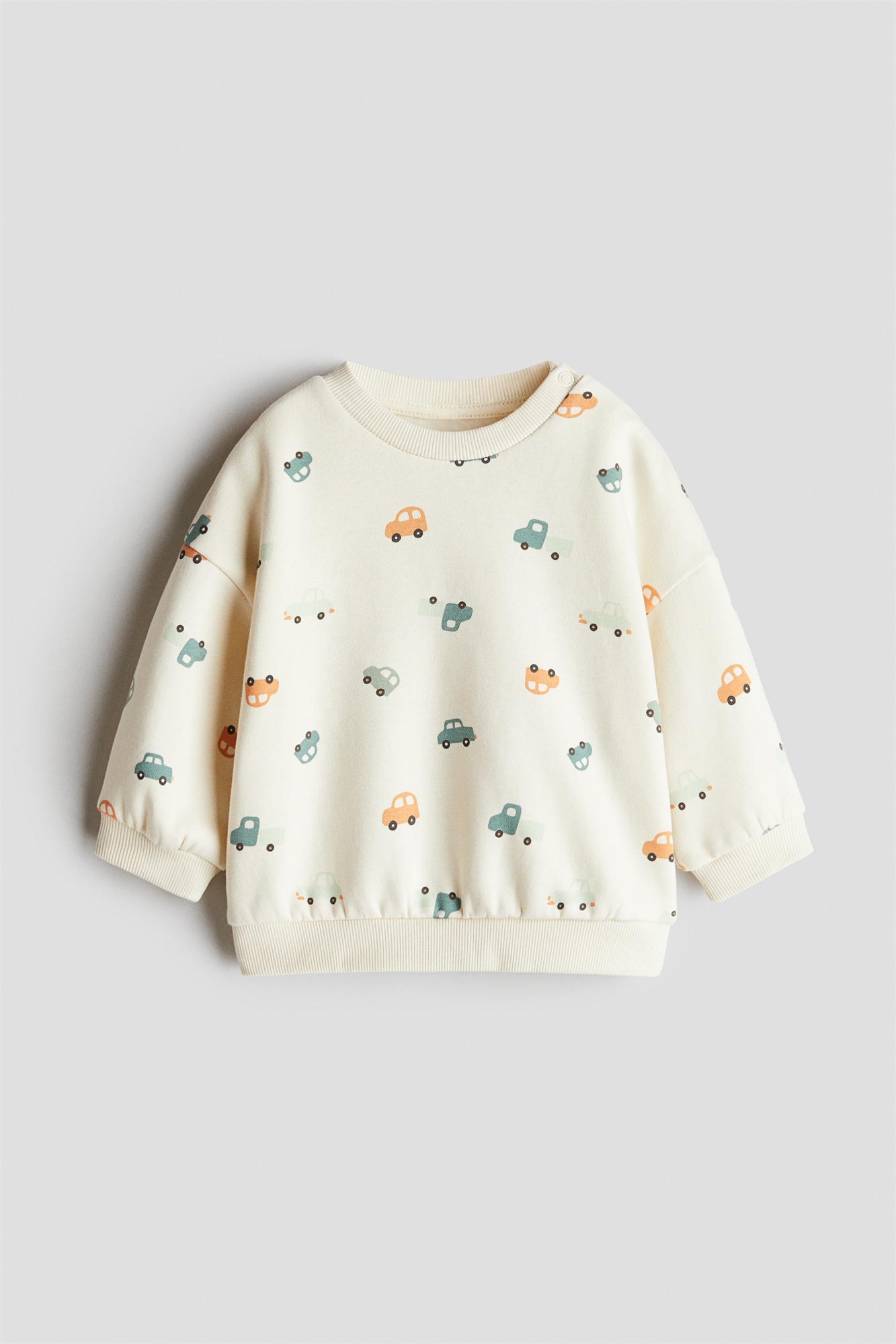 Топ из принтованной толстовки с мягким начесом внутри. Круглый вырез в рубчик с застежками с одной стороны (кроме размеров 2-4Y), спущенные плечи, манжеты и подол в рубчик.