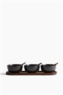 Набор из трех небольших салатников из керамики, трех ложек и подноса из дерева манго. Реактивная глазурь создает красивые, переменчивые цвета, которые придают каждому изделию уникальный вид. Высота чаши 5 см. Диаметр чаши 11,6 см. Длина подноса 36,5 см.