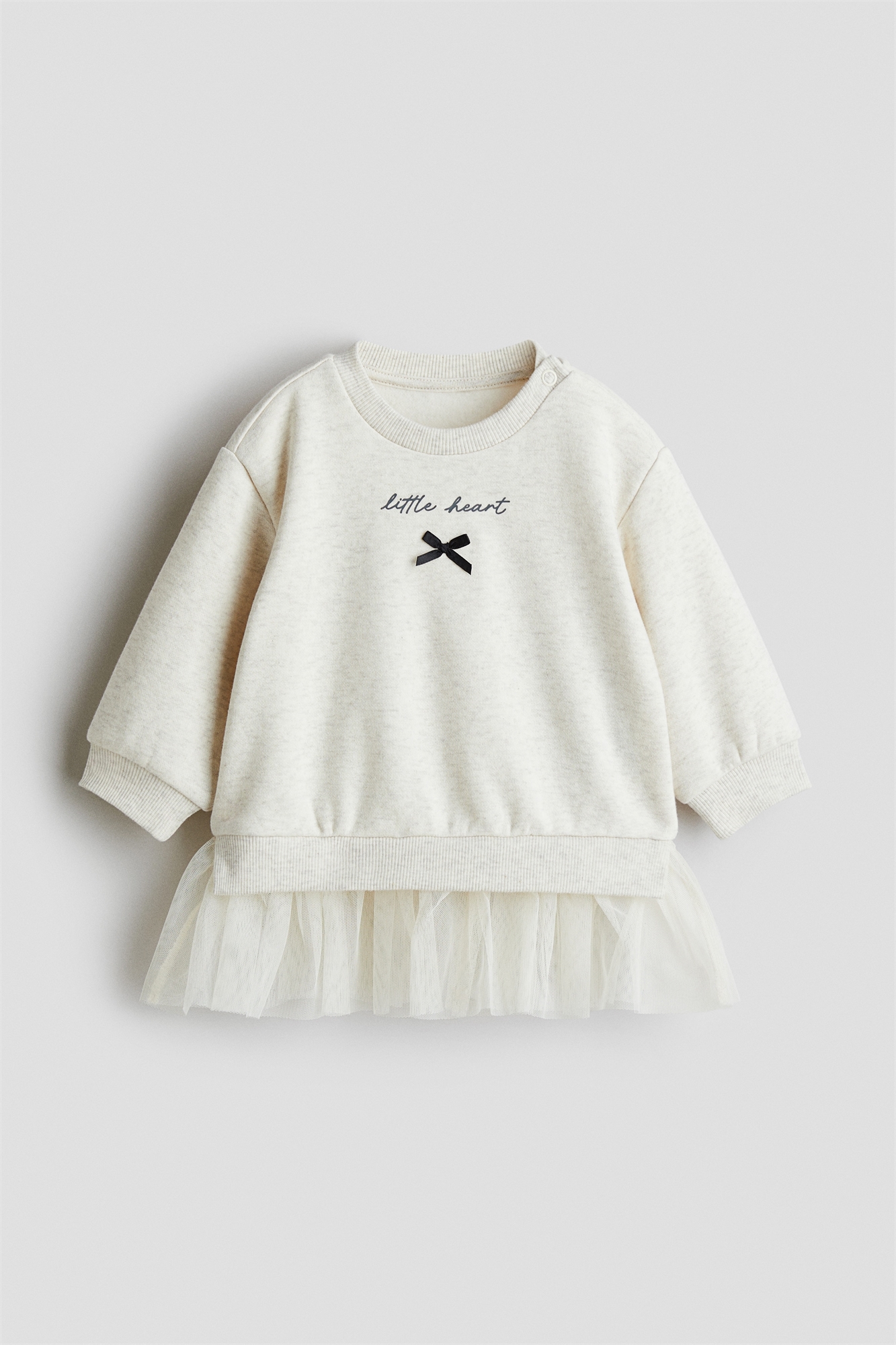 Платье из мягкой, легкой ткани свитшот с юбкой из тюля. Круглый вырез в рубчик с застежками с одной стороны, спущенные плечи и длинные рукава с манжетами в рубчик.