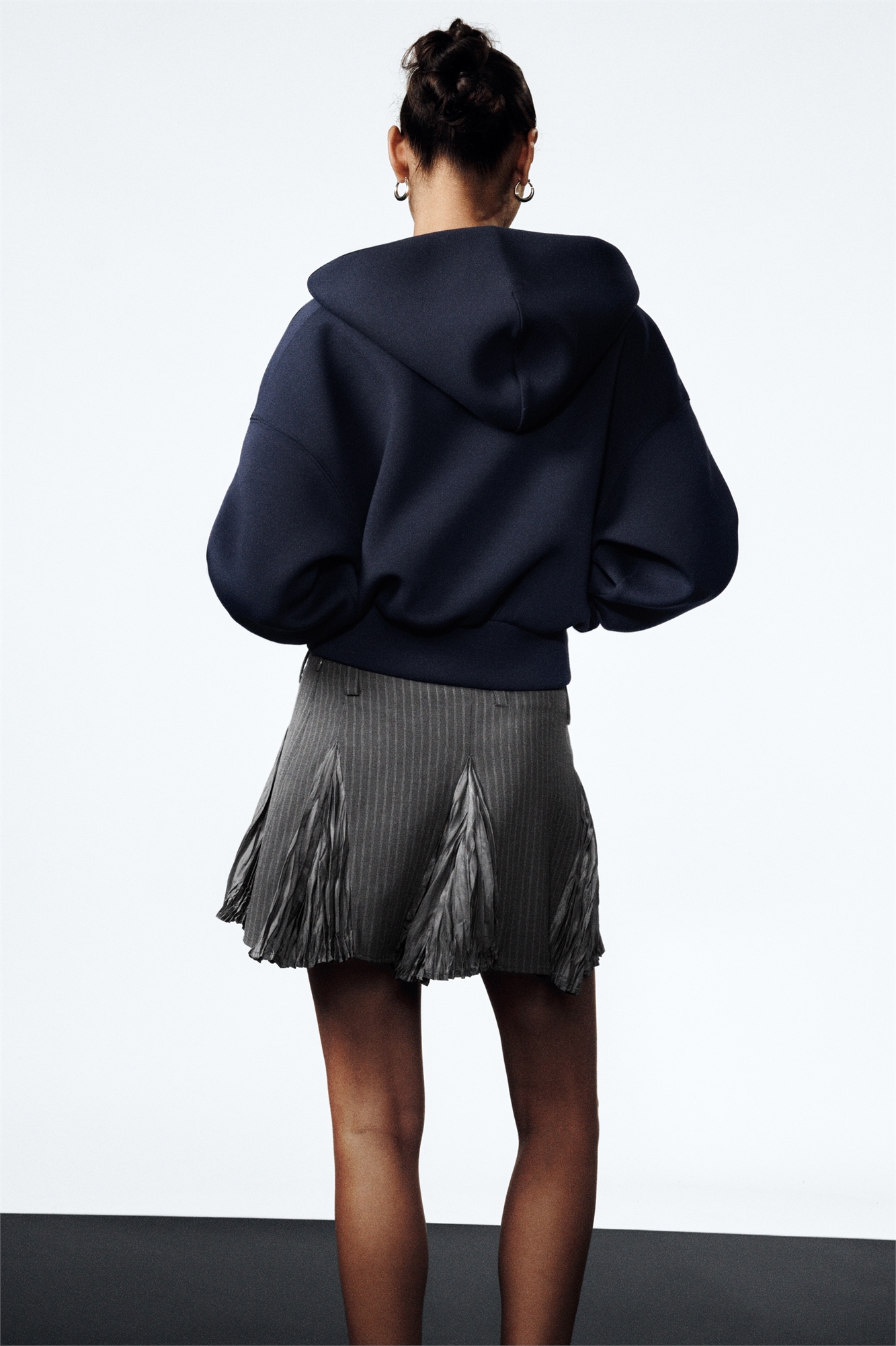Мини-юбка расклешенного фасона с плиссированными контрастными вставками. Изготовленная из структурированной саржи, она имеет среднюю талию с тональными петлями для ремня. Застежка на молнию и крючок с ушком сбоку, а также мягкие складки, придающие объем и движение.