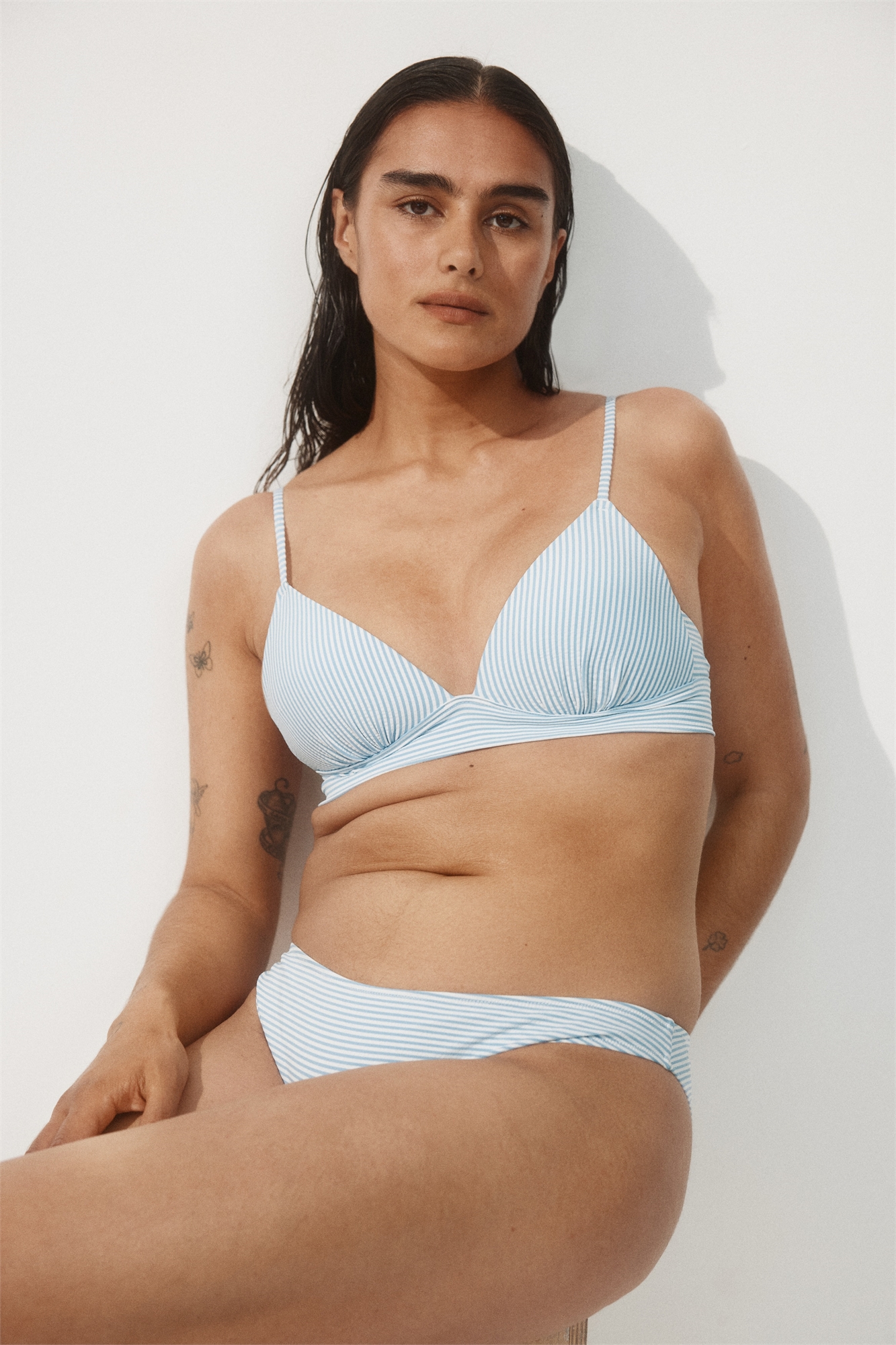 Бикини-топ на подкладке с регулируемыми бретелями и мягкими чашечками для увеличения бюста и декольте. Застежка на крючки сзади.