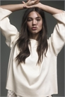 Джемпер оверсайз из мягкого тонкого трикотажа с круглым вырезом в рубчик и длинными, слегка расклешенными рукавами.
