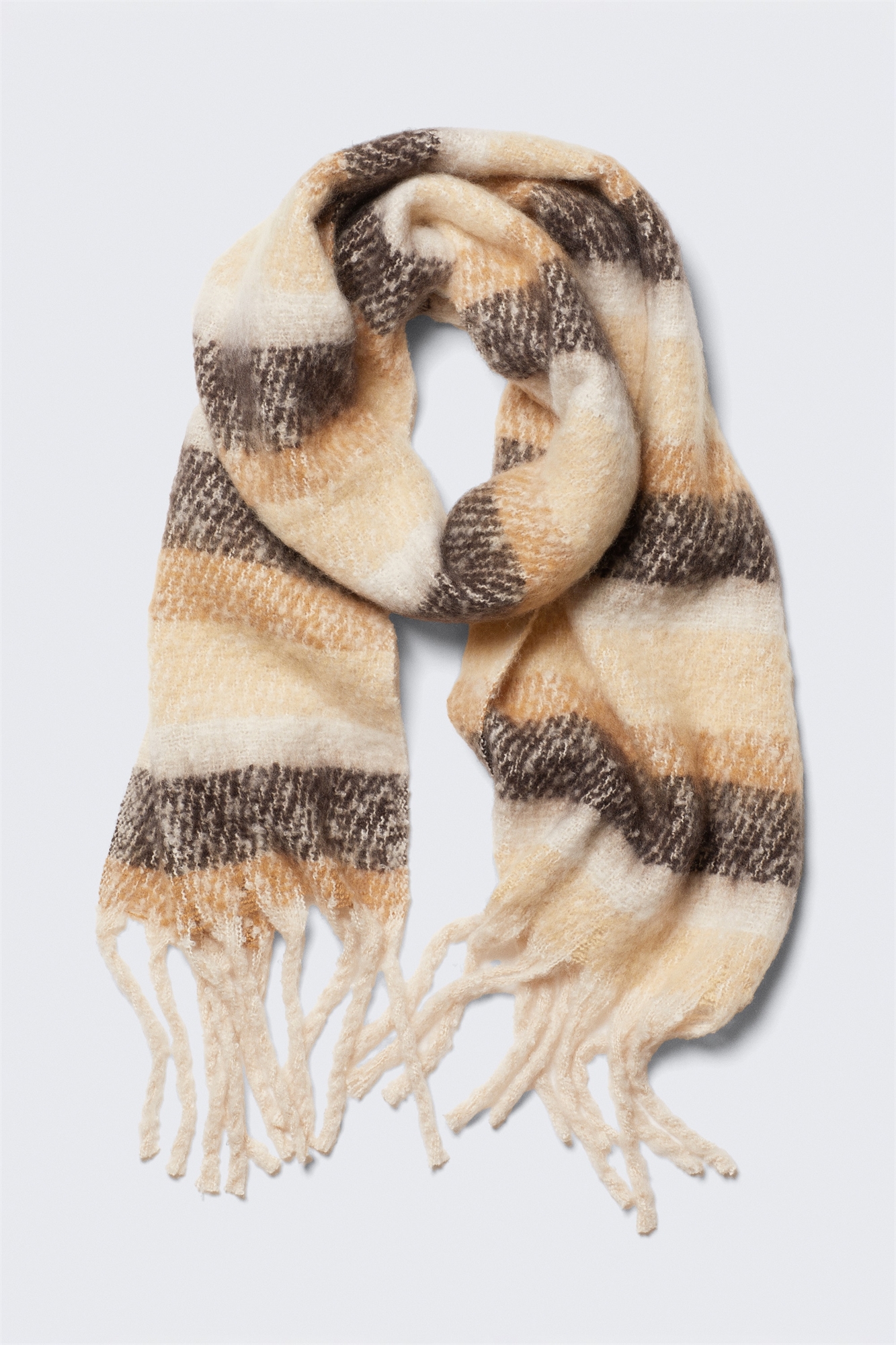 Длинный широкий шарф с мягкой текстурой и бахромой на концах. Слегка пушистый, он легко ложится на плечи и придает тактильную изюминку образу в холодную погоду. Размеры примерно 180 x 35 см (без учета бахромы).