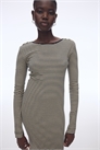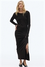 Приталенное платье длиной до щиколоток из ребристого хлопкового джерси с круглым вырезом, совковой спиной и длинными рукавами. Подол прямого кроя с разрезом с одной стороны.