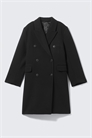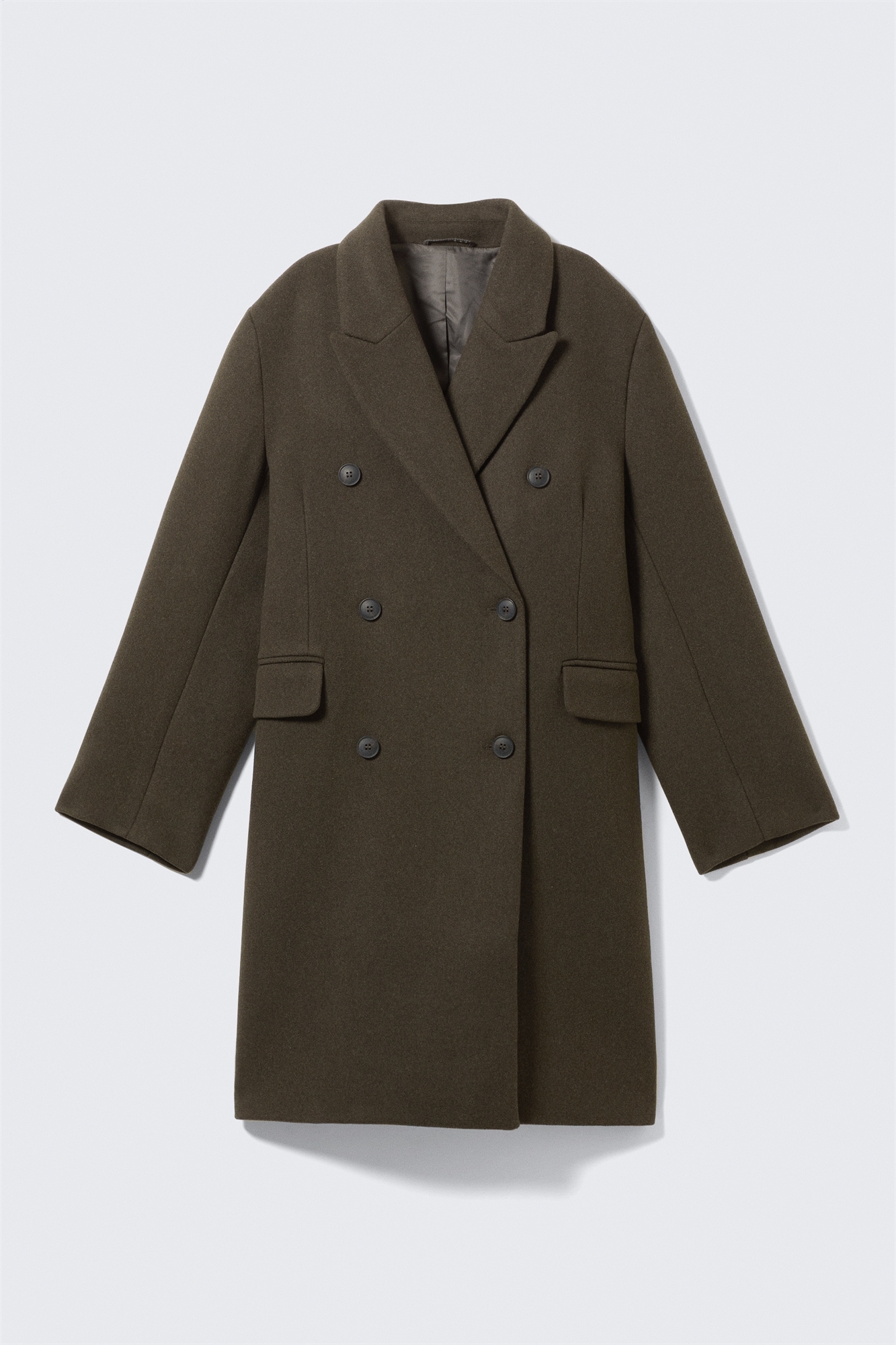 Двубортное пальто длиной до колена с силуэтом оверсайз. Изготовленное из теплой шерстяной смеси, оно имеет структурированные плечи с накладками, воротник с зазубренными лацканами и полную подкладку для чистоты внутренней отделки. Спереди расположены втачные карманы с клапанами увеличенного размера, сзади - вентиляционные отверстия, а спереди - классическая застежка на пуговицах.