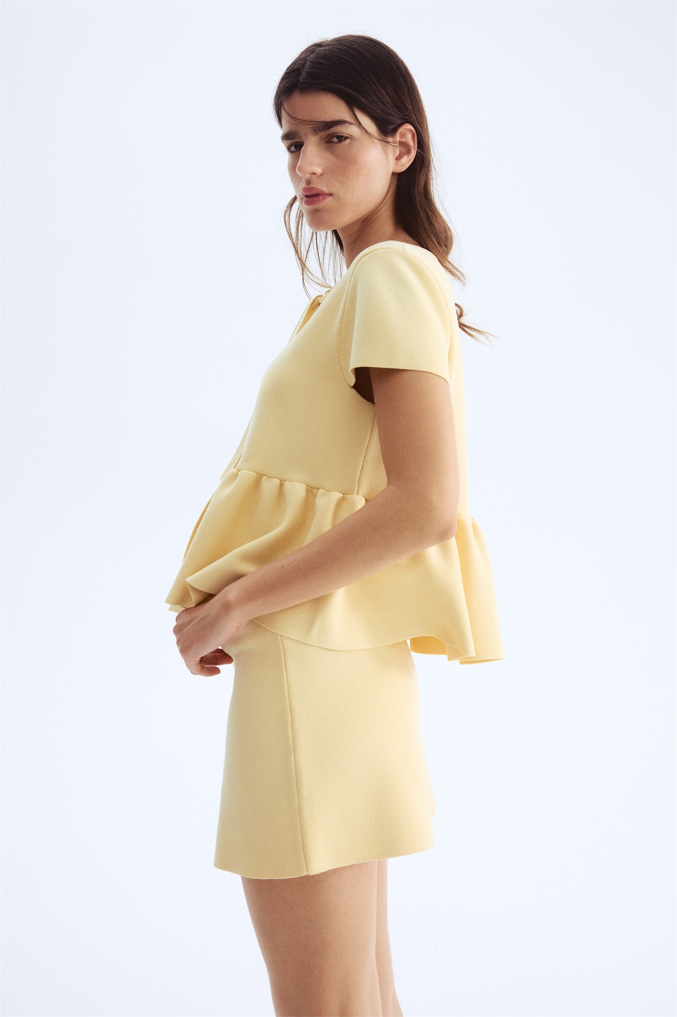 Топ с короткими рукавами из плотного трикотажа, с круглым вырезом, двумя завязками спереди и расклешенным пуловером.