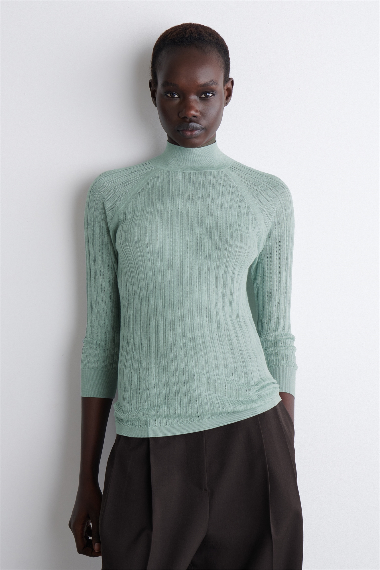 В сезоне Pre-Fall 2025 классические трикотажные модели переосмыслены. Эта вещь, выполненная в приглушенном бирюзовом тоне, вяжется мелкой вязкой из первоклассного шелка малбери и шерсти мериноса с полупрозрачной отделкой и имеет облегающий силуэт со слегка обрезанными рукавами. Зауженный кройИзделие содержит шерстяное волокно Responsible Wool Standard TE-00047206 (RWS) с ферм, сертифицированных по требованиям к благополучию животных и землепользованию Состав: 70% шелк малбери, 30% шерсть мериноса. Без учета отделки / Машинная стирка Длина по спинке для размера S составляет 60 см / Модель носит размер S