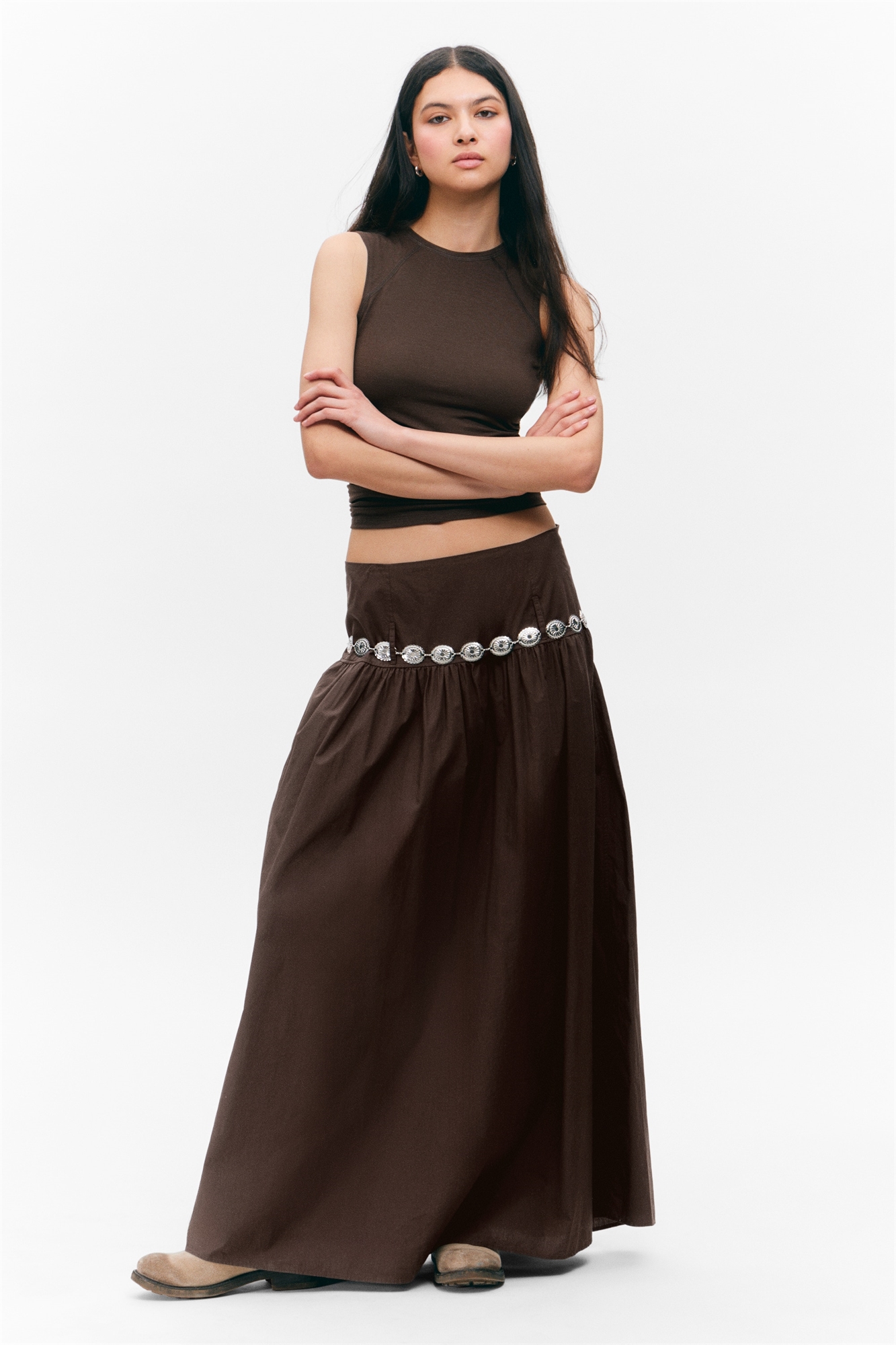 Юбка во всю длину с объемным силуэтом и низкой посадкой. Она сшита из хрустящего хлопкового поплина и дополнена поясом с тонкой отделкой и петлями для ремня, карманами в боковых швах и мягкими складками, переходящими в широкий подол. Потайная застежка-молния сбоку и простроченные швы по всей длине придают образу изысканность.