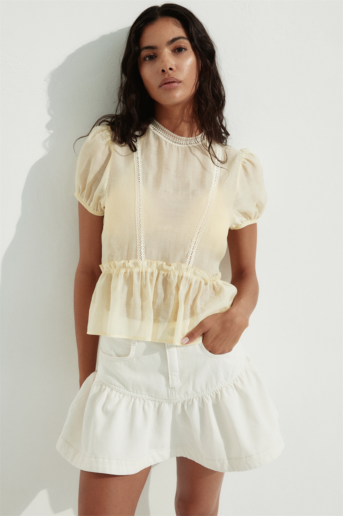 Блузка из лиоцеллового микса с кружевным воротником-бантом, кружевными вставками спереди и разрезом на пуговице сзади. Короткие пышные рукава с манжетами на резинке, сборка и оборка на талии и расклешенная складка.