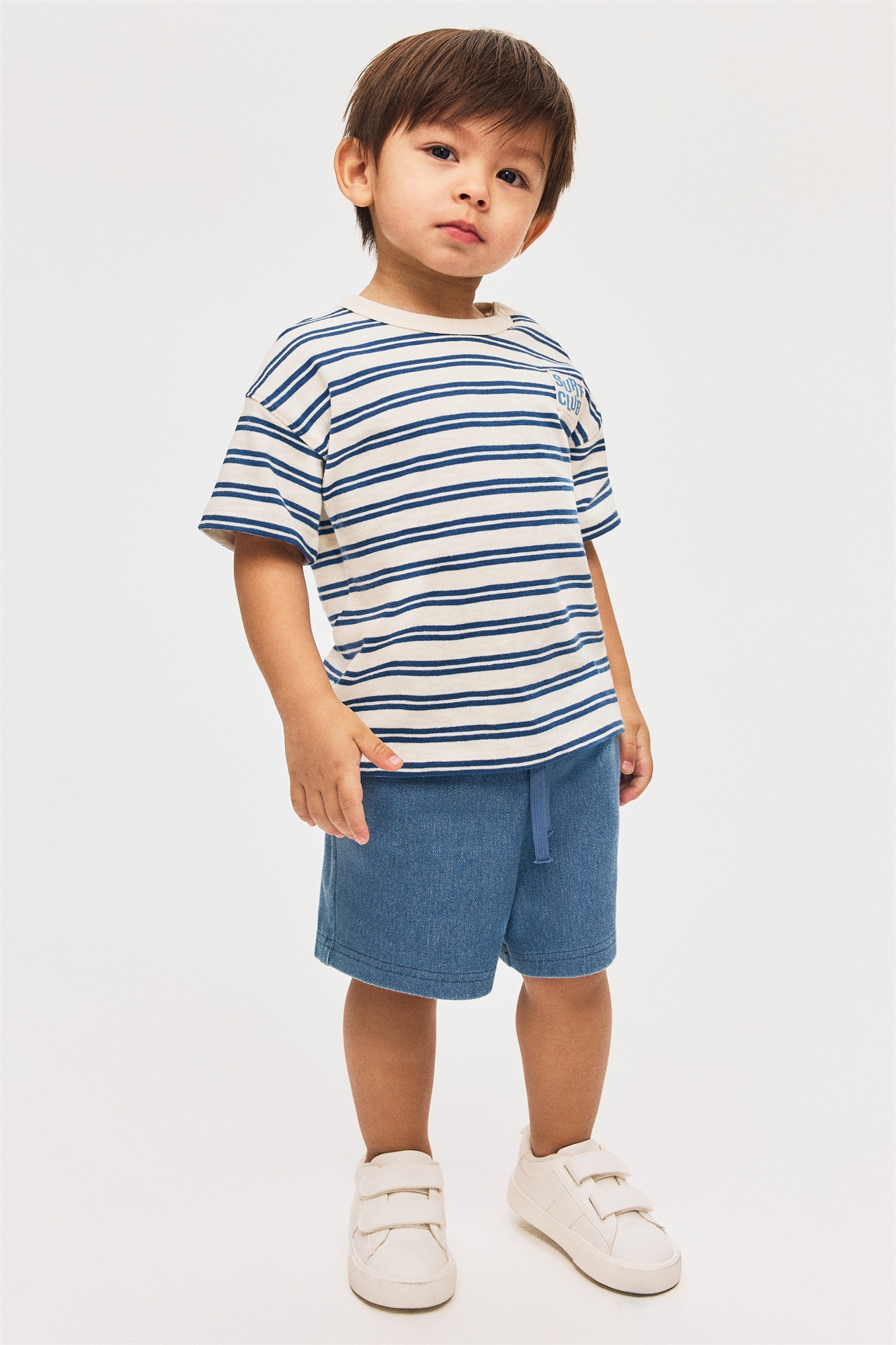 Шорты из мягкого джинсового трикотажа с эластичным поясом и диагональными карманами спереди.