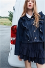 Короткая куртка из хлопкового денима с широкой оборкой по бокам спереди. Воротник, застежка на пуговицы спереди и ярмо с боковыми складками сзади. Боковые карманы.