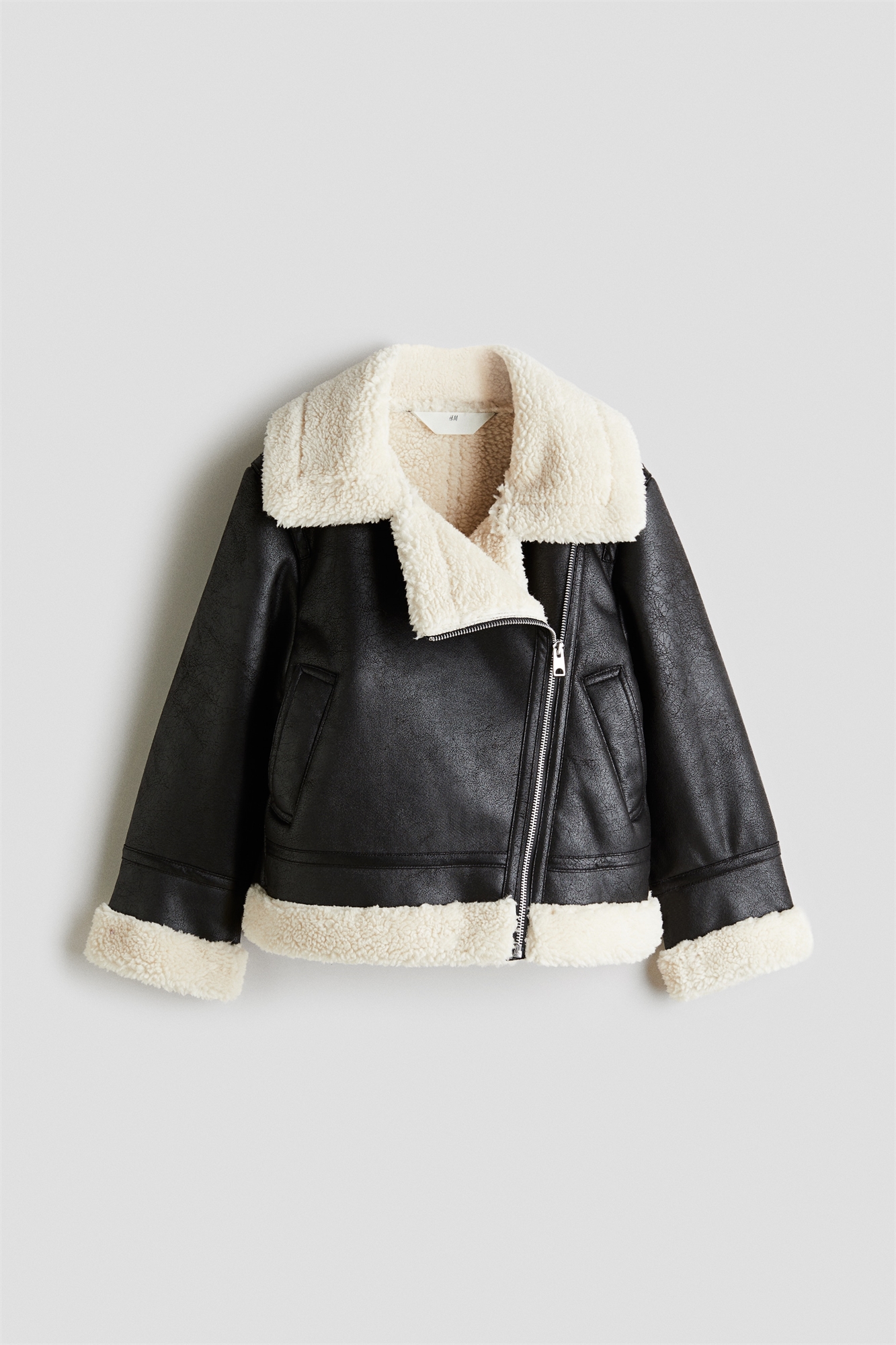 Куртка из ткани с покрытием, воротник, манжеты, подол и подкладка из мягкого плюша. Лацканы с вырезом, диагональная застежка-молния спереди и прорезные боковые карманы.