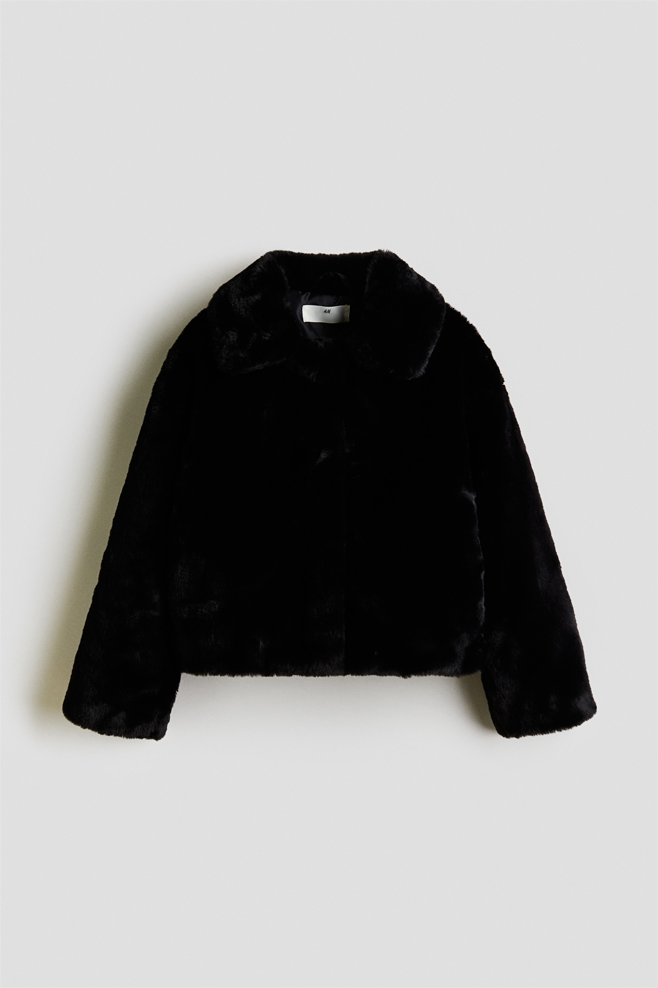 Короткий жакет из мягкой пушистой ткани с воротником и потайными кнопками спереди.