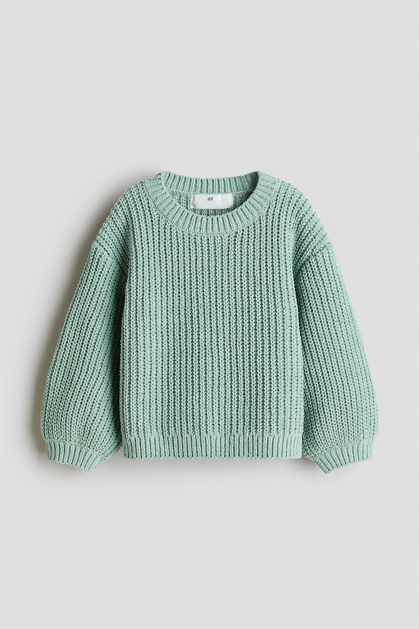 Джемпер из мягкого синельного трикотажа с бархатистой поверхностью. Круглый вырез с ребристой отделкой, спущенные плечи и длинные рукава-баллон. Ребристые манжеты и подол.