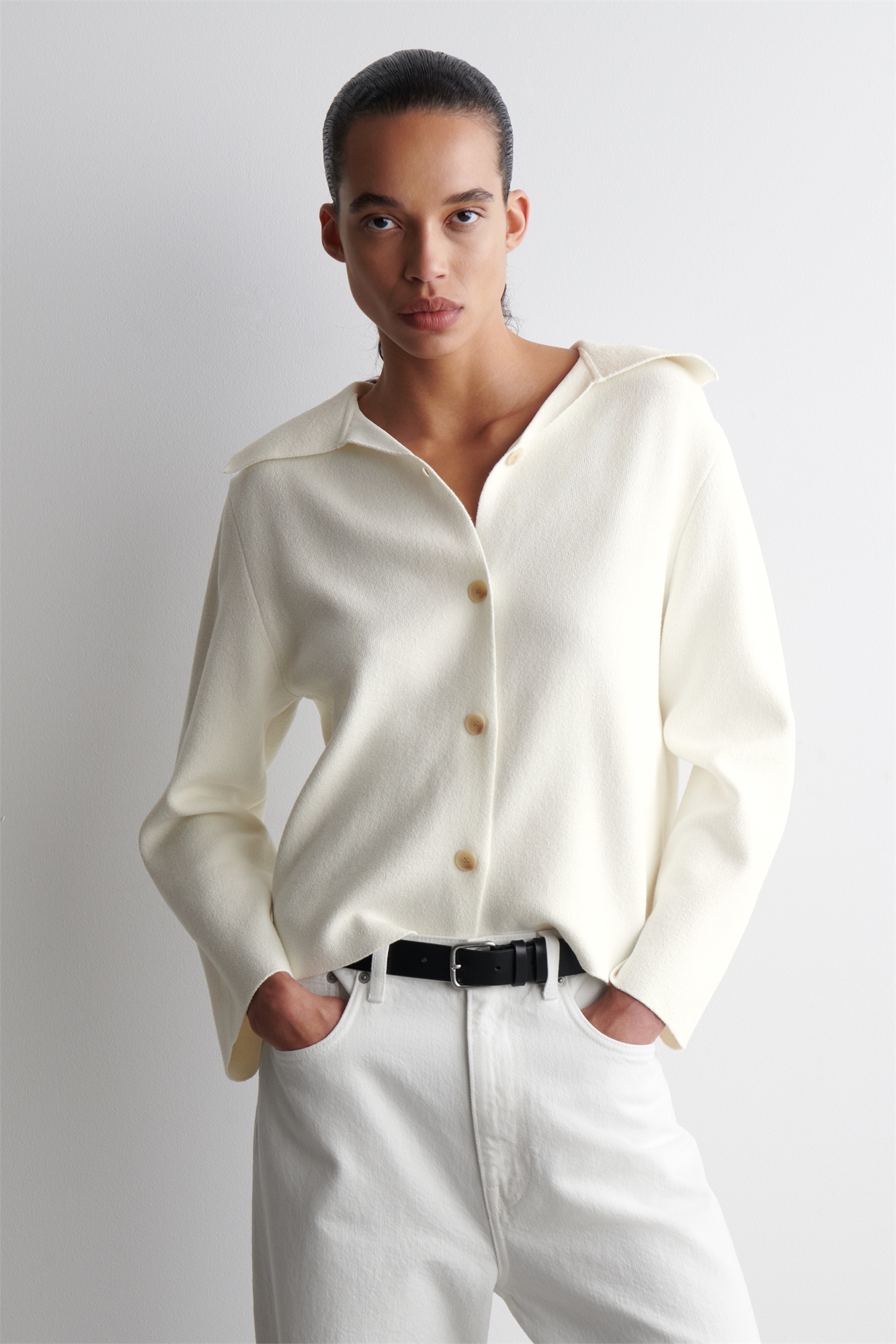 Эта изысканная вещь легко подойдет для переходного стиля. Вязаная из мягкой хлопковой ткани с двойным лицевым покрытием, она представлена в неизменно белом цвете и имеет широкий воротник, расходящийся по плечам. Носите его как жакет или кардиган. Свободный кройЗастежка на пуговицахПереработанный полиамид - это полиамид, полученный из текстильных отходов при производстве Состав: 38% переработанный полиамид (переработанный нейлон), 35% хлопок, 26% вискоза, 1% эластан. Без учета отделки / Машинная стирка Длина по спинке для размера S составляет 55 см / Модель носит размер S