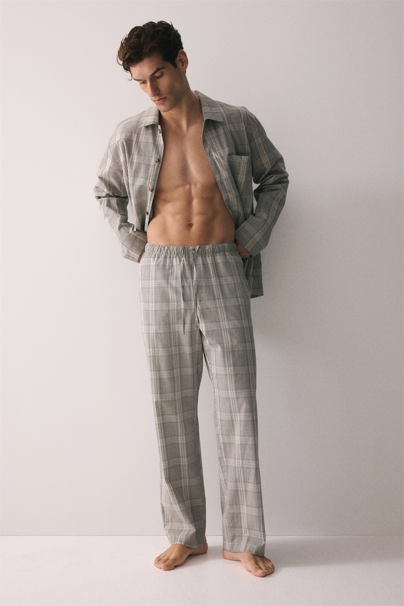 Пижама с рубашкой и нижней частью из воздушного хлопкового поплина. Рубашка с отложным воротником, французским передом, нагрудным карманом с маленькой вышитой деталью и прямым покроем подола. Нижние брюки с эластичным поясом со скрытым шнурком и декоративной пуговицей спереди, фальшивой ширинкой и незаметными боковыми карманами.
