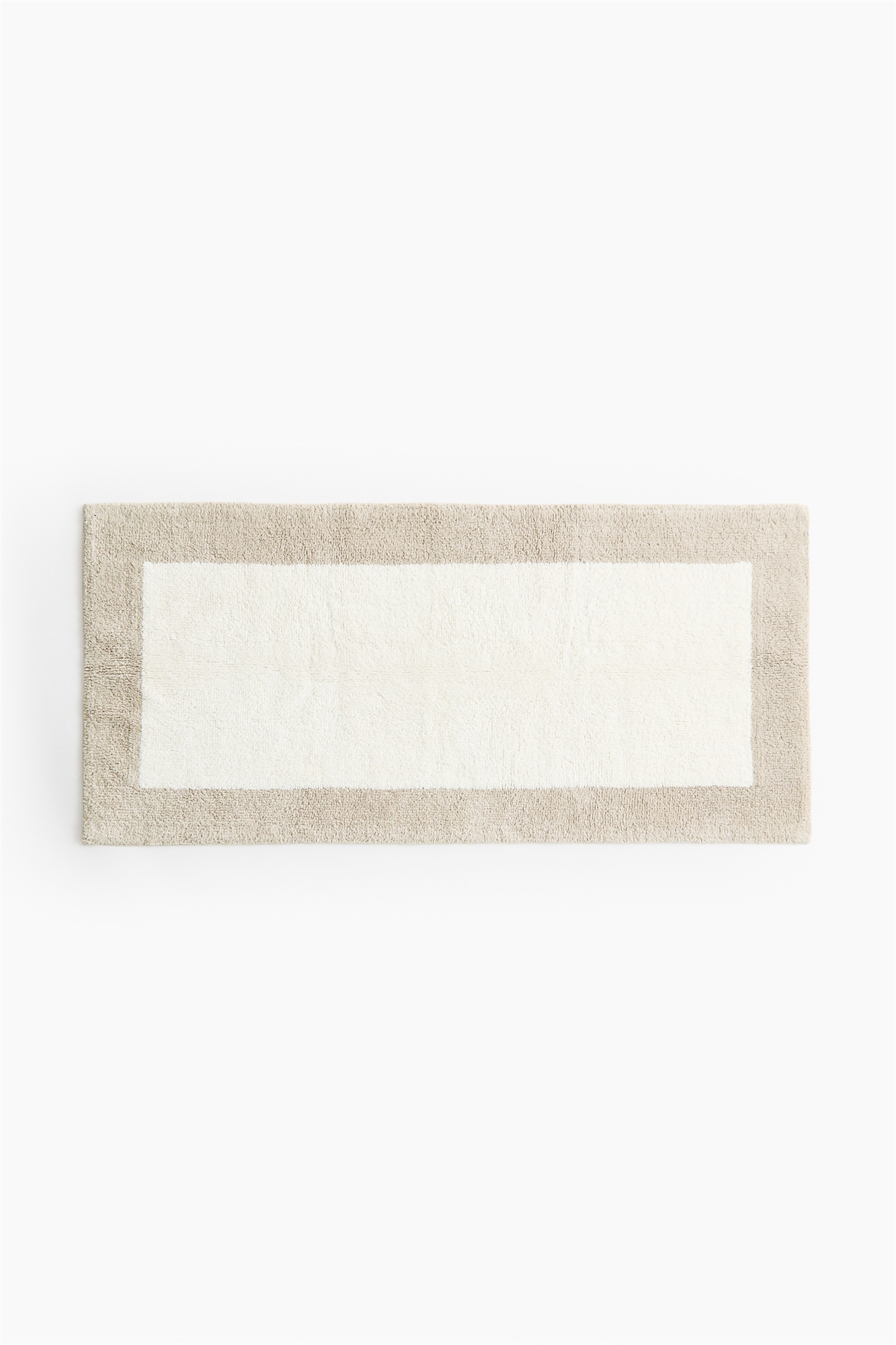 Коврик для ванной из хлопка с ворсом, который мягко и уютно ложится под ноги. Он имеет контрастную окантовку на лицевой стороне и противоскользящие ручки на обратной стороне.