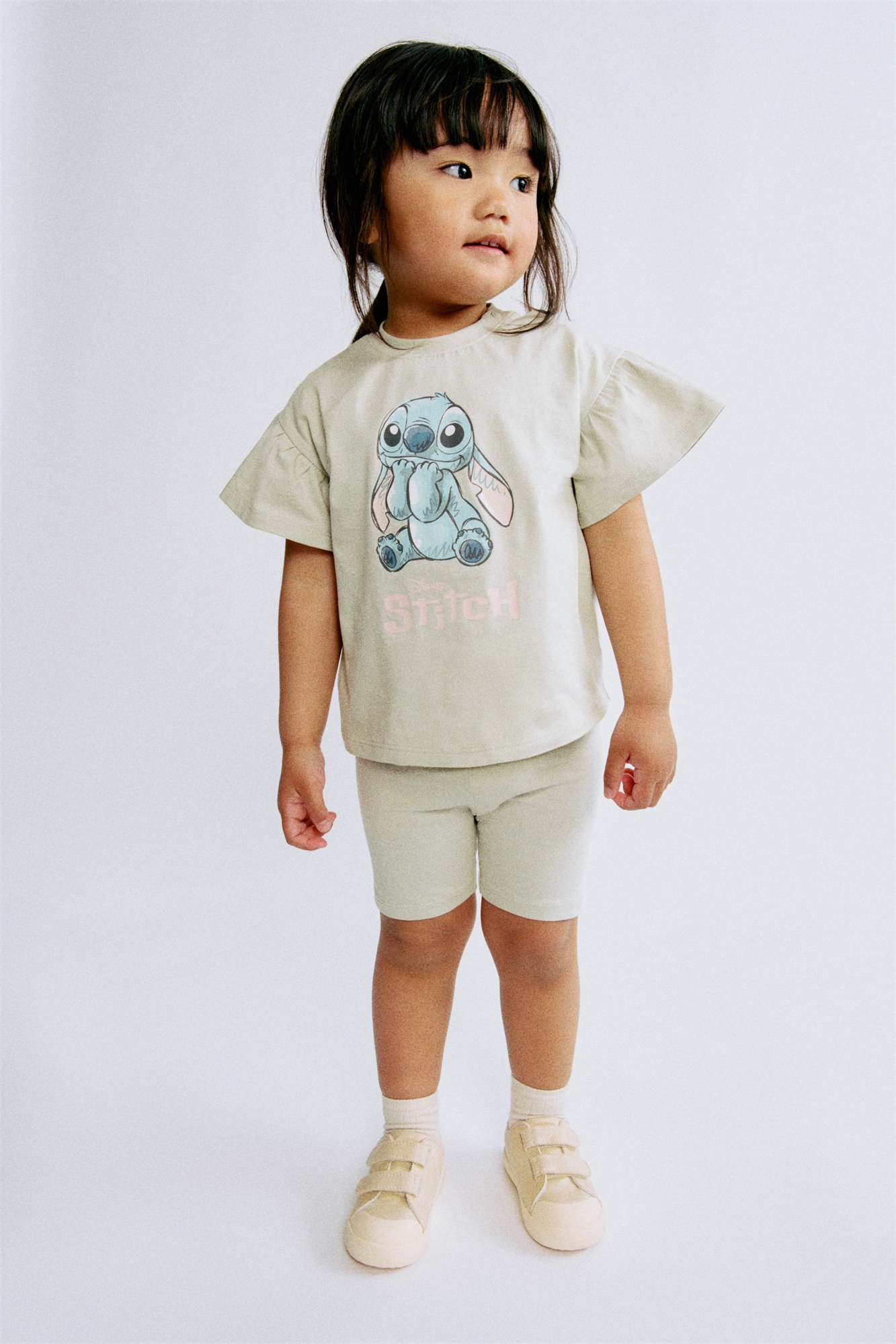 Комплект из топа и велошорт из мягкого хлопкового джерси. Топ с принтом спереди, круглым вырезом с застежками с одной стороны (кроме размеров 2-4Y), спущенными плечами и короткими расклешенными рукавами. Велосипедные шорты с регулируемым эластичным поясом.