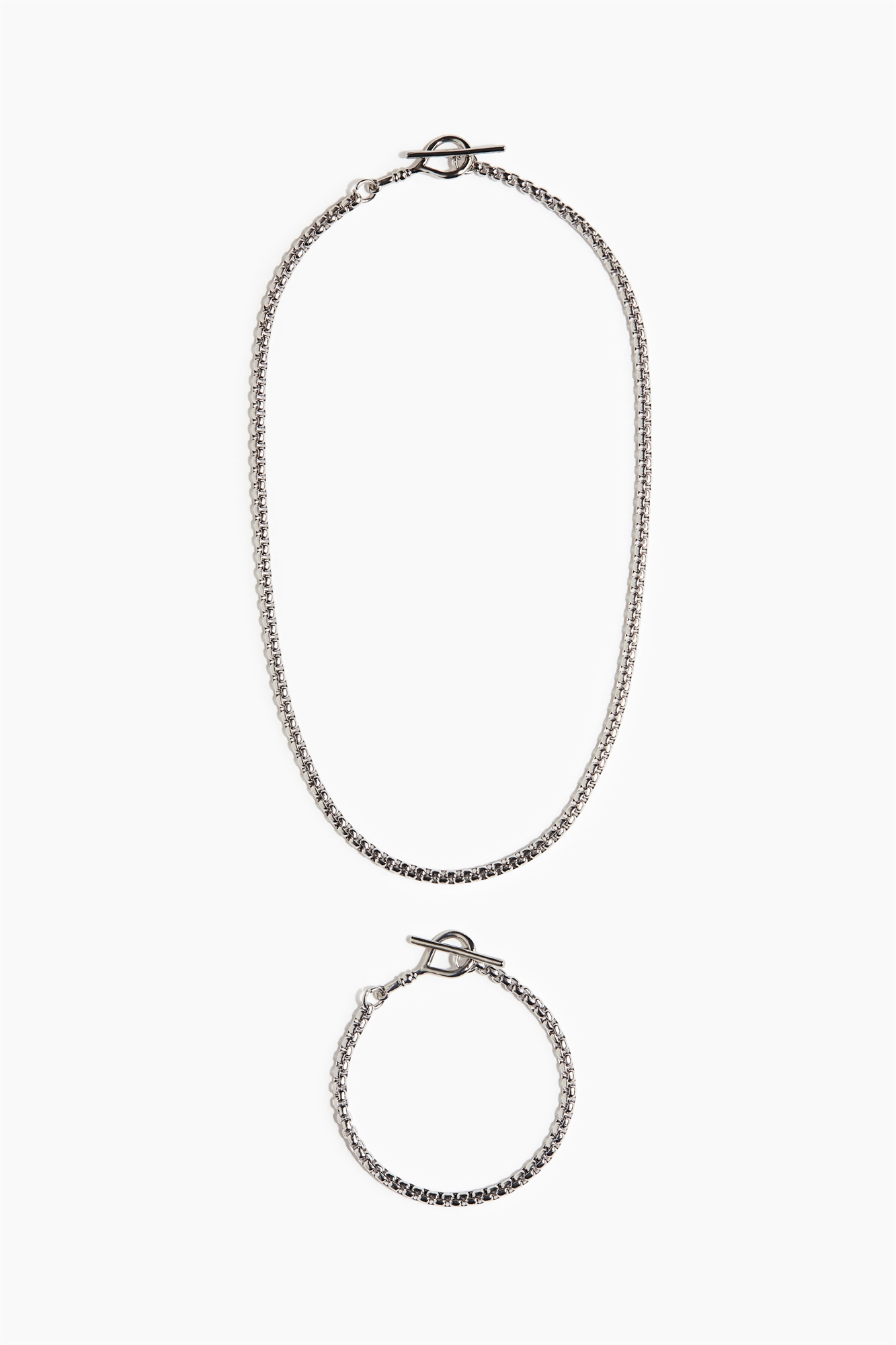 Металлическое ожерелье и браслет в тон, оба с простой застежкой-тоглом.