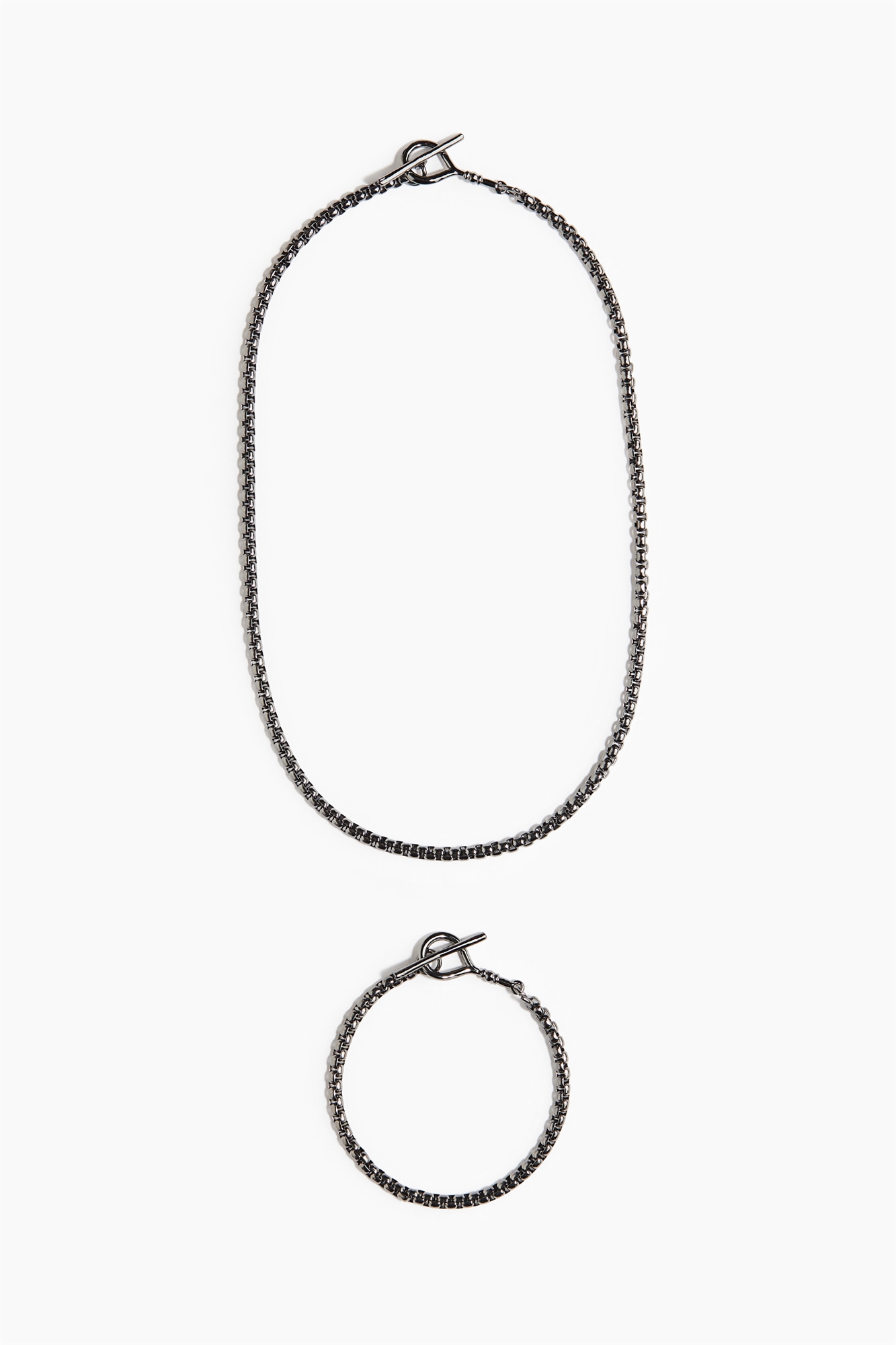 Металлическое ожерелье и браслет в тон, оба с простой застежкой-тоглом.