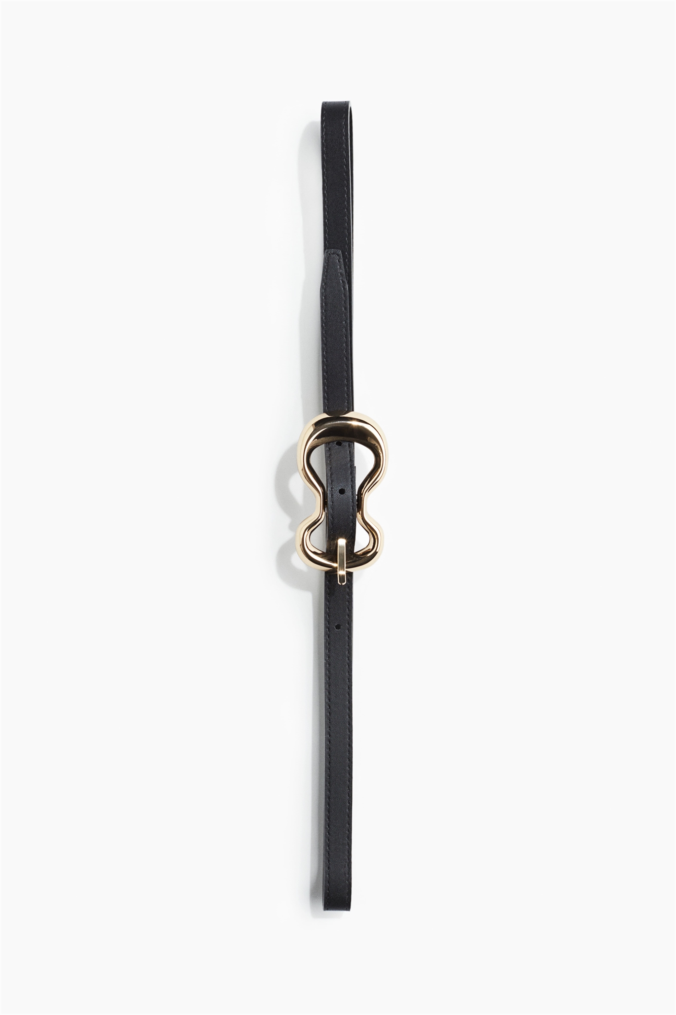 Узкий ремень из ткани с покрытием и асимметричной металлической пряжкой с блестящей отделкой.