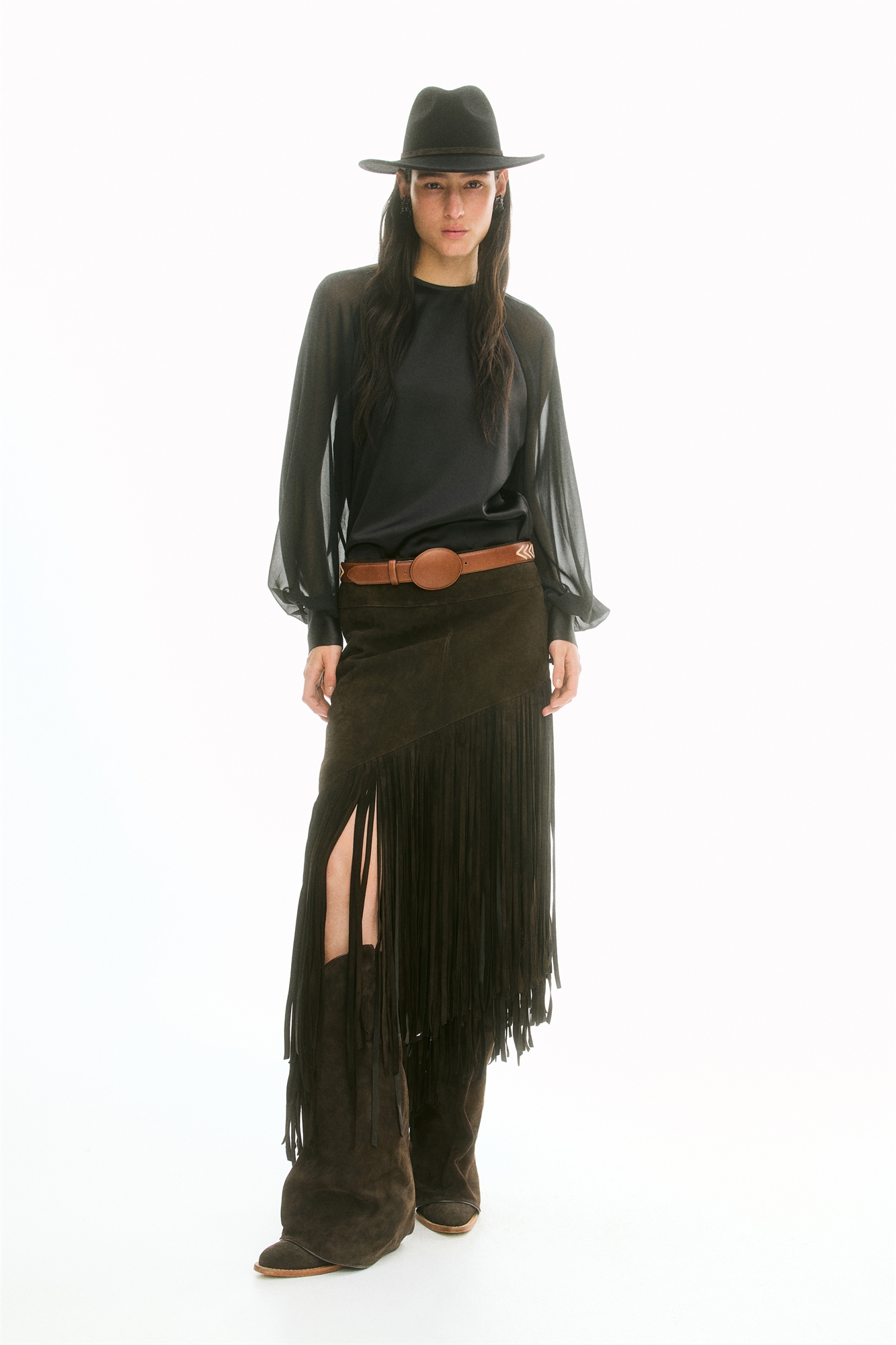 Длинная приталенная юбка из мягкой замши с диагональным разрезом от бедра до колена и тремя слоями длинной, вырезанной лазером бахромы. Двухслойный пояс с потайной застежкой на молнию и пуговицу сзади. На застежке-молнии выгравирован логотип дизайнера. Подкладка из вискозной саржи.