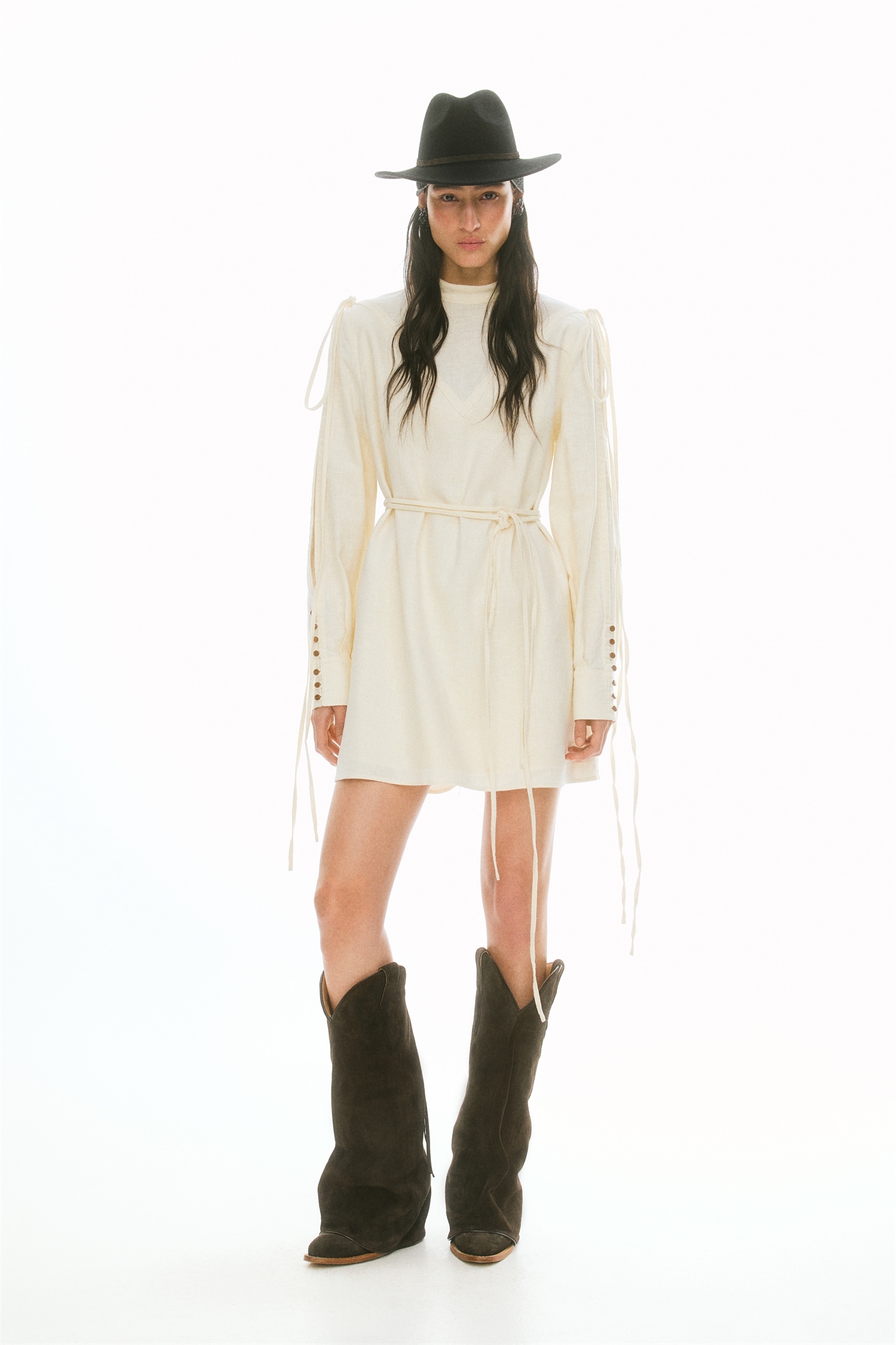 Короткое платье из воздушного льняного и хлопкового полотна с воротником-стойкой и V-образным передним ярмом. Длинные раздельные рукава с аккуратной застежкой на пуговицы и петли на манжетах и длинными завязками на плечевых швах. Глубокая прорезь сзади, застегивающаяся сверху на аккуратные пуговицы и петли. А-линия силуэта с нагрудными вытачками и узкими завязками с каждой стороны, которые можно обернуть и завязать на талии. На подкладке.