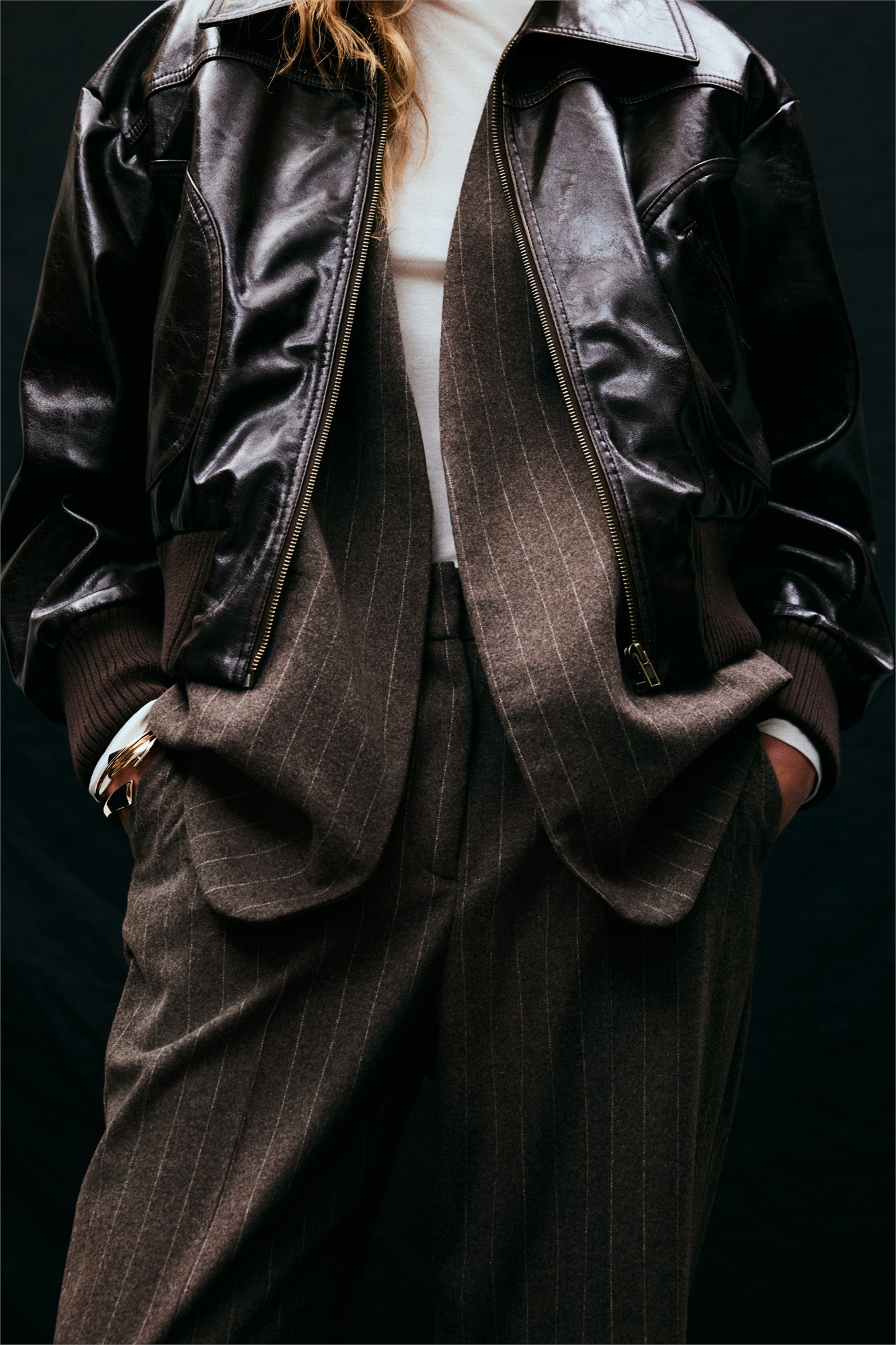 Свободный жилет из тканого материала с V-образным вырезом горловины, формирующими вытачками на талии и втачными карманами спереди. Без застежек. На подкладке.