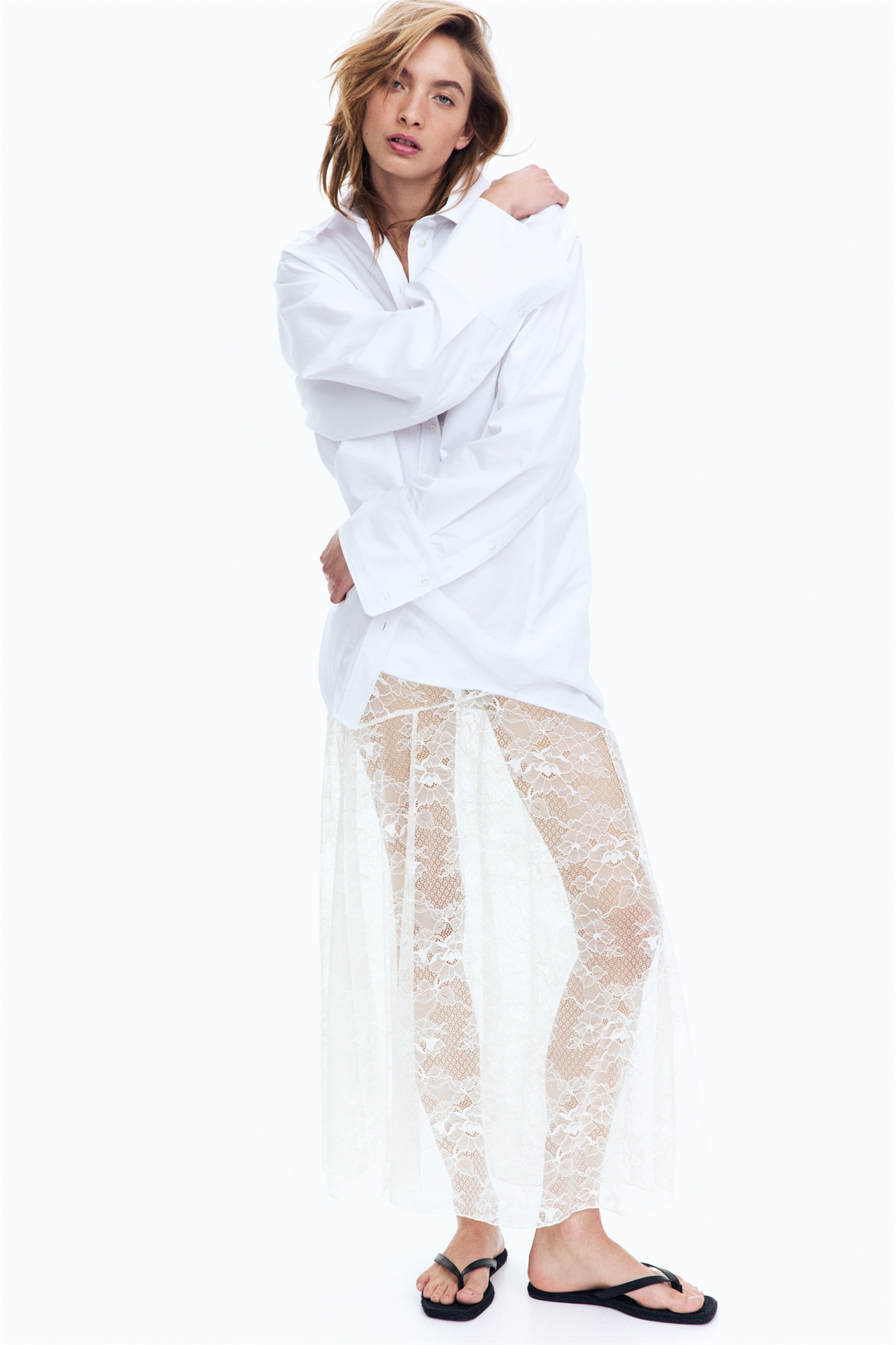Кружевная юбка длиной до щиколоток с высокой талией и узким эластичным поясом, а также диагональным швом от бедра для придания объема подолу. Без подкладки.
