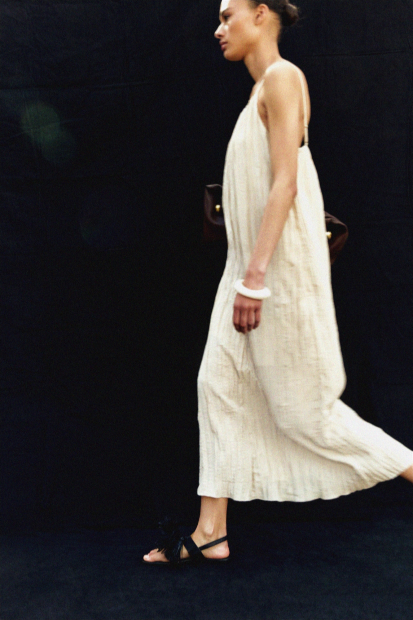 Длинное платье свободного покроя из мятой ткани с регулируемыми бретелями-спагетти. V-образный вырез и вырез с закрытой металлической проволокой спереди. Расклешенный, А-линейный силуэт. На подкладке.