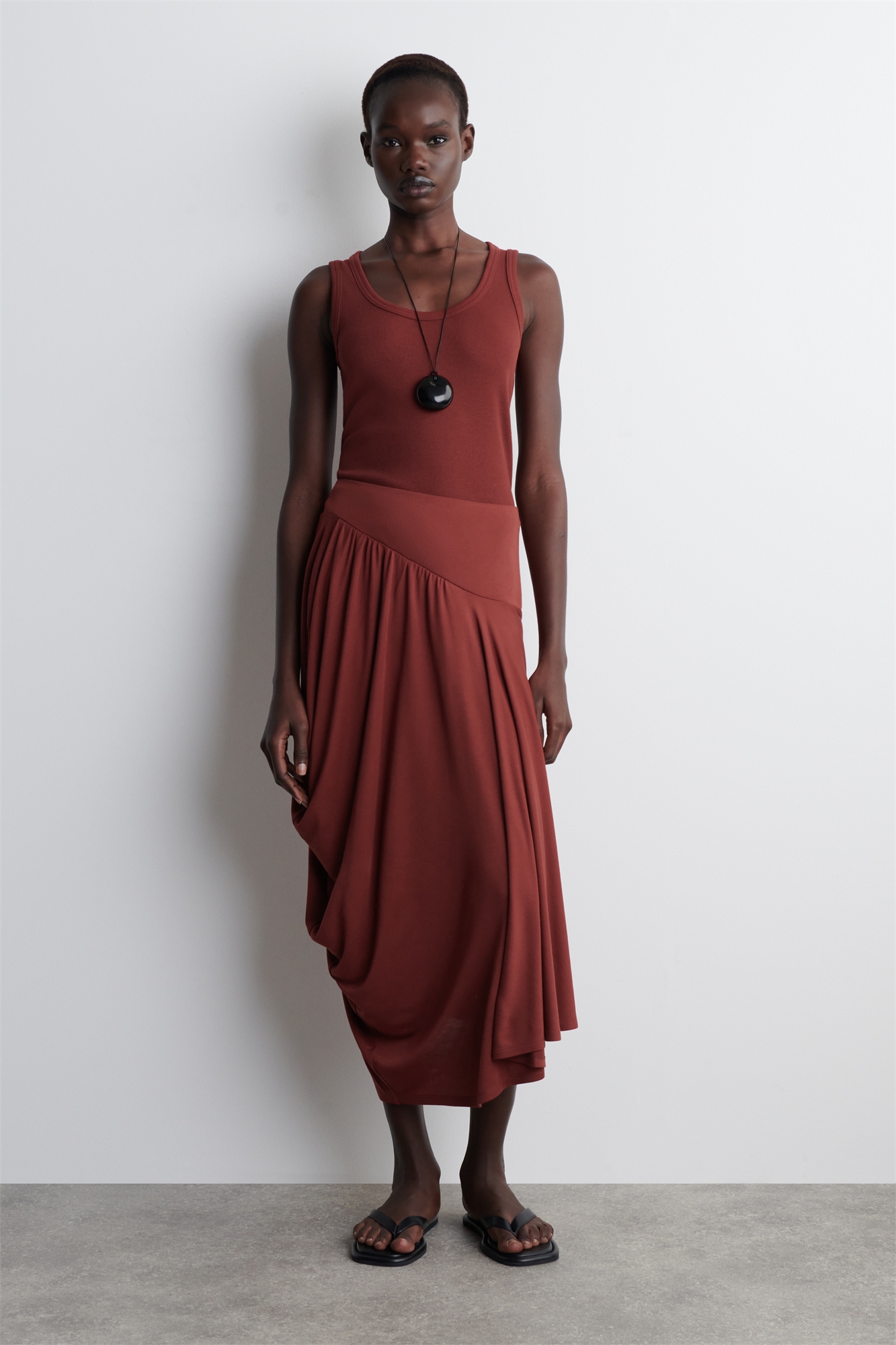 Мягкие драпированные силуэты привносят современную женственность в коллекцию женской одежды. Эта асимметричная юбка сшита из эластичного модального джерси и имеет эластичный пояс и струящийся подол миди. Насыщенный красный цвет является ключевым в этом сезоне. Regular fit Материал: 100% модал. Без учета отделки / Машинная стирка Длина по спинке для размера S составляет 73 см / Модель носит размер S