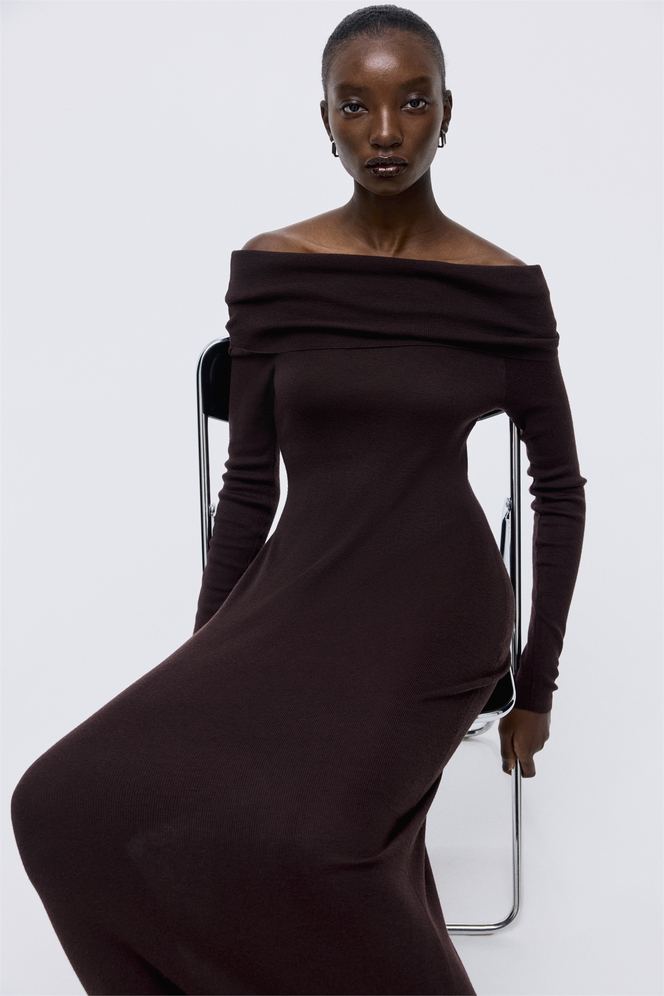 Приталенное платье длиной до щиколоток из мягкого тонкого трикотажа с длинными рукавами и широкой складкой в верхней части.